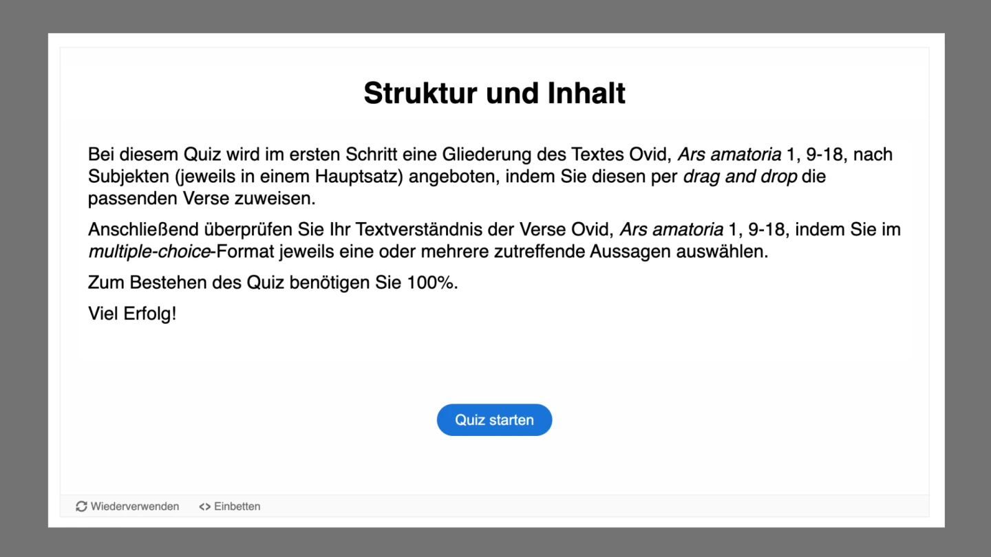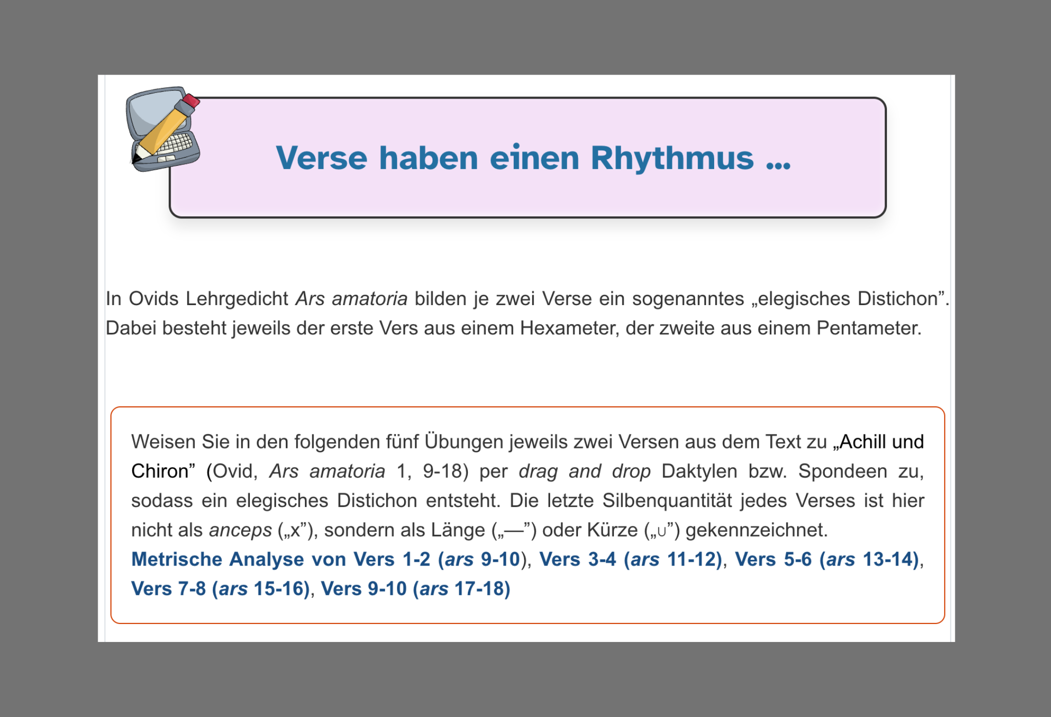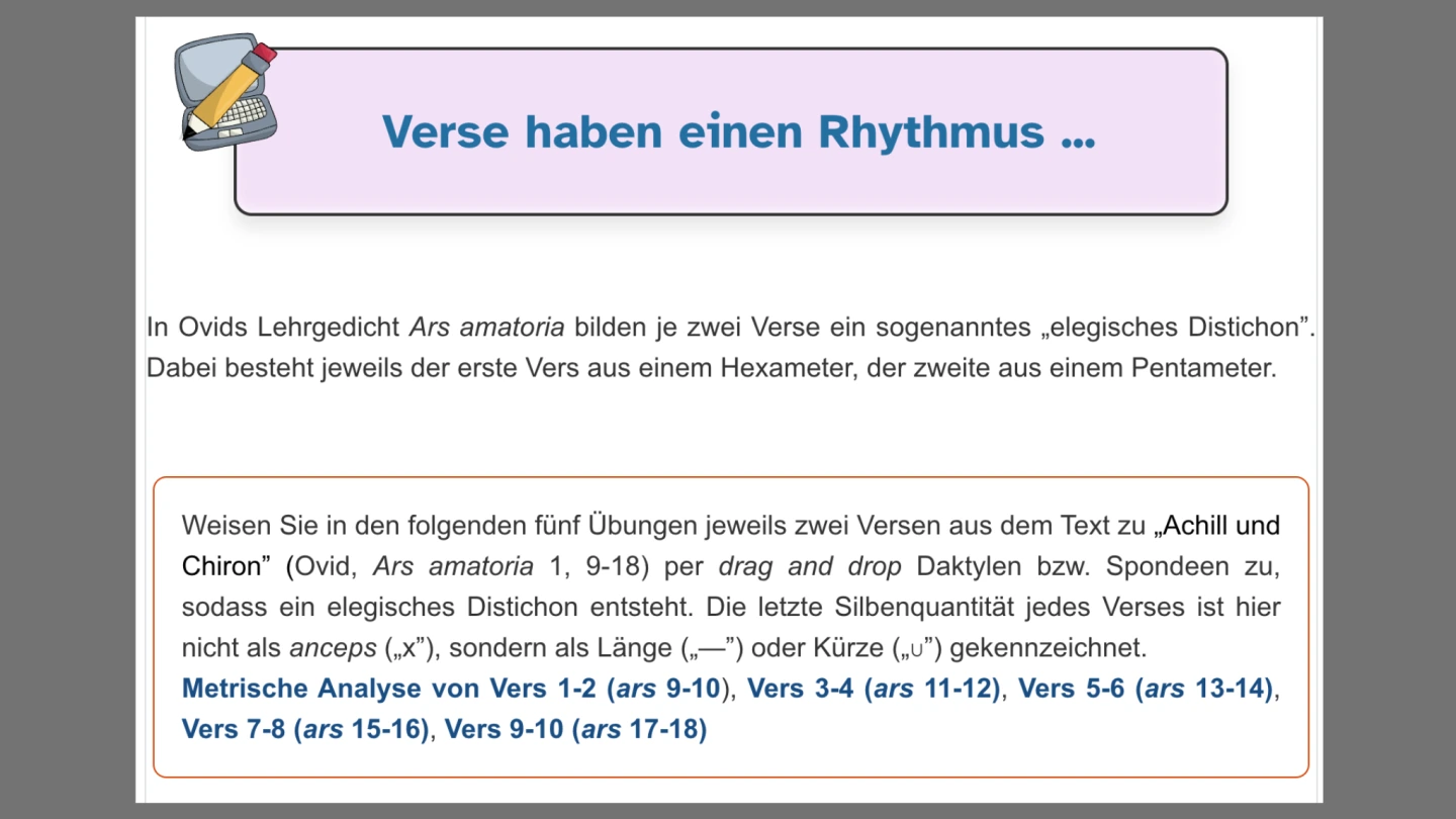 Im dritten Abschnitt („Achill und Chiron: Text“) ist zunächst eine „Übersetzung“ der zehn Ovid-Verse vorgesehen, die durch eine Aktivität im Lückentext-Format stark entlastet ist und ein sofortiges Feedback ermöglicht. Einer genaueren Textanalyse dienen je ein Quiz und eine Textdatei mit Lösungsvorschlägen zu den Kriterien „Inhalt und Struktur“, „Sachfelder“ und „Stilmittel“. Zum Thema „Metrik“ haben die Jugendlichen die Möglichkeit, in fünf separaten Aktivitäten bis zu fünf elegische Distichen in einer digitalen Zuordnungsübung metrisch zu analysieren. Eine vollständige metrische Analyse der zehn Ovid-Verse findet man wiederum in einer Textdatei.