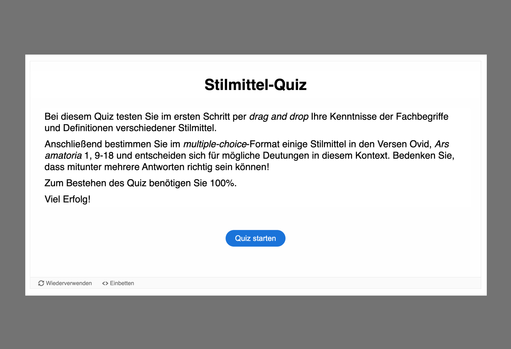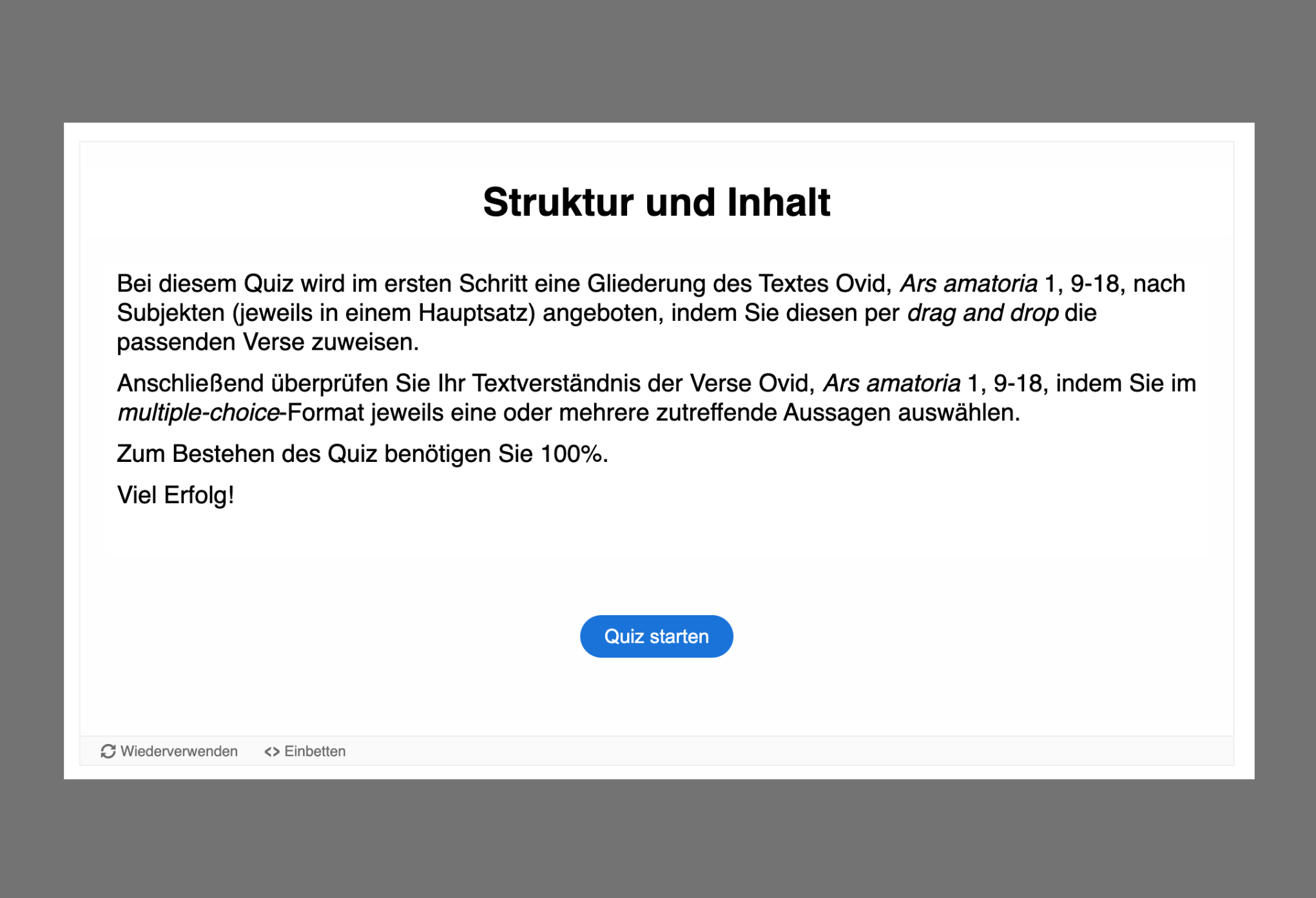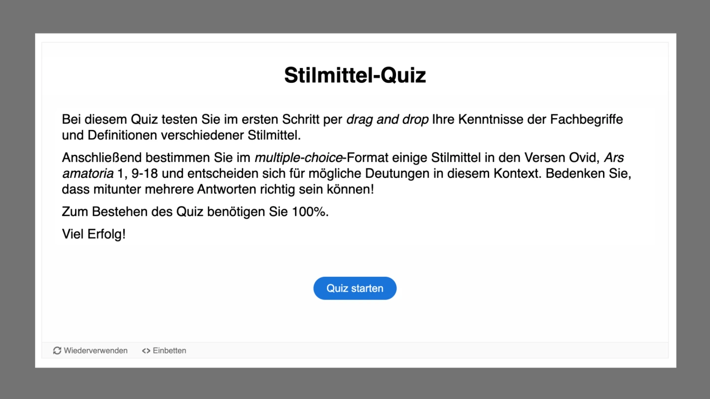 Im dritten Abschnitt („Achill und Chiron: Text“) ist zunächst eine „Übersetzung“ der zehn Ovid-Verse vorgesehen, die durch eine Aktivität im Lückentext-Format stark entlastet ist und ein sofortiges Feedback ermöglicht. Einer genaueren Textanalyse dienen je ein Quiz und eine Textdatei mit Lösungsvorschlägen zu den Kriterien „Inhalt und Struktur“, „Sachfelder“ und „Stilmittel“. Zum Thema „Metrik“ haben die Jugendlichen die Möglichkeit, in fünf separaten Aktivitäten bis zu fünf elegische Distichen in einer digitalen Zuordnungsübung metrisch zu analysieren. Eine vollständige metrische Analyse der zehn Ovid-Verse findet man wiederum in einer Textdatei.