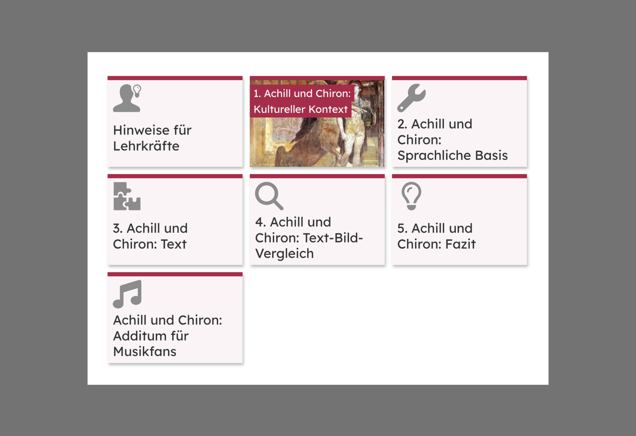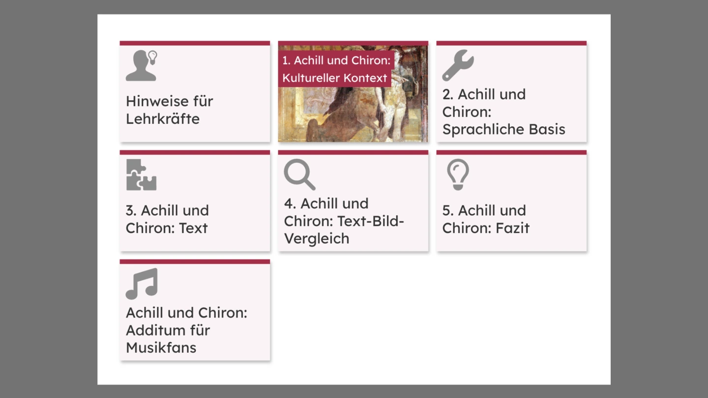 Im ersten Abschnitt („Achill und Chiron: Kultureller Kontext“) werden die Schülerinnen und Schüler kurz in den literarischen Hintergrund eingeführt und erwerben sich durch einen Rechercheauftrag Kenntnisse zu sechs Eigennamen, die ihnen in der Textstelle begegnen. Die wesentlichen Aspekte zum sachlichen Verständnis der Namen innerhalb der Verse werden in einer spielerischen Kontrollübung aufgegriffen, getestet und anhand einer direkten Rückmeldung gesichert.