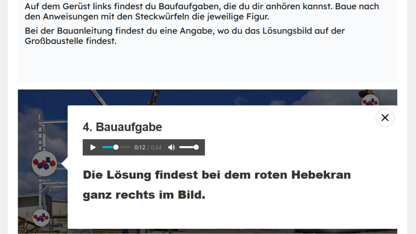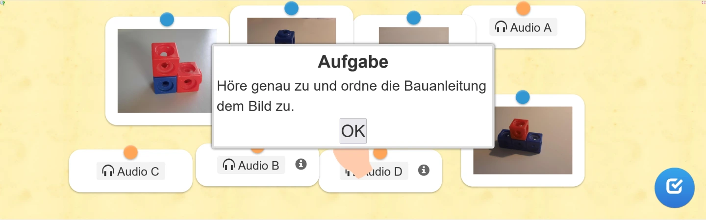 Das Zuordnen der gesprochenen Bautexte zu den passenden Fotos per drag and drop erfordert genaues Zuhören, Kenntnis der Raum-Lage-Begriffe und feinmotorische Fähigkeiten