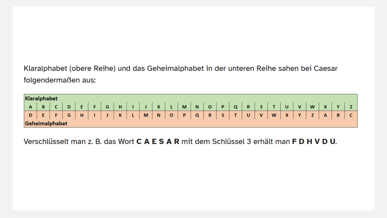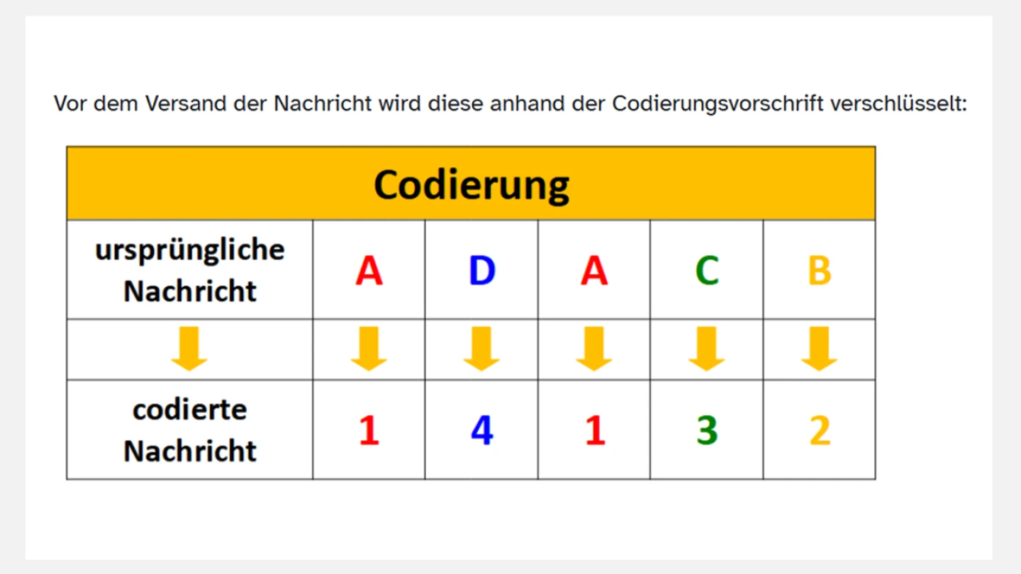 Zum Einstieg in die Lernaufgabe informieren sich die Schülerinnen und Schüler, wie Codierung und Decodierung einer Nachricht grundsätzlich funktionieren. Anhand eines einfachen Beispiels erfahren die Lernenden, dass zur Codierung einer Nachricht zwei Zeichenvorräte und eine Codierungsvorschrift notwendig sind und der Empfänger zur Decodierung der Nachricht auch die beiden Zeichenvorräte und den Schlüssel kennen muss (Einzelarbeit, 10 Minuten).