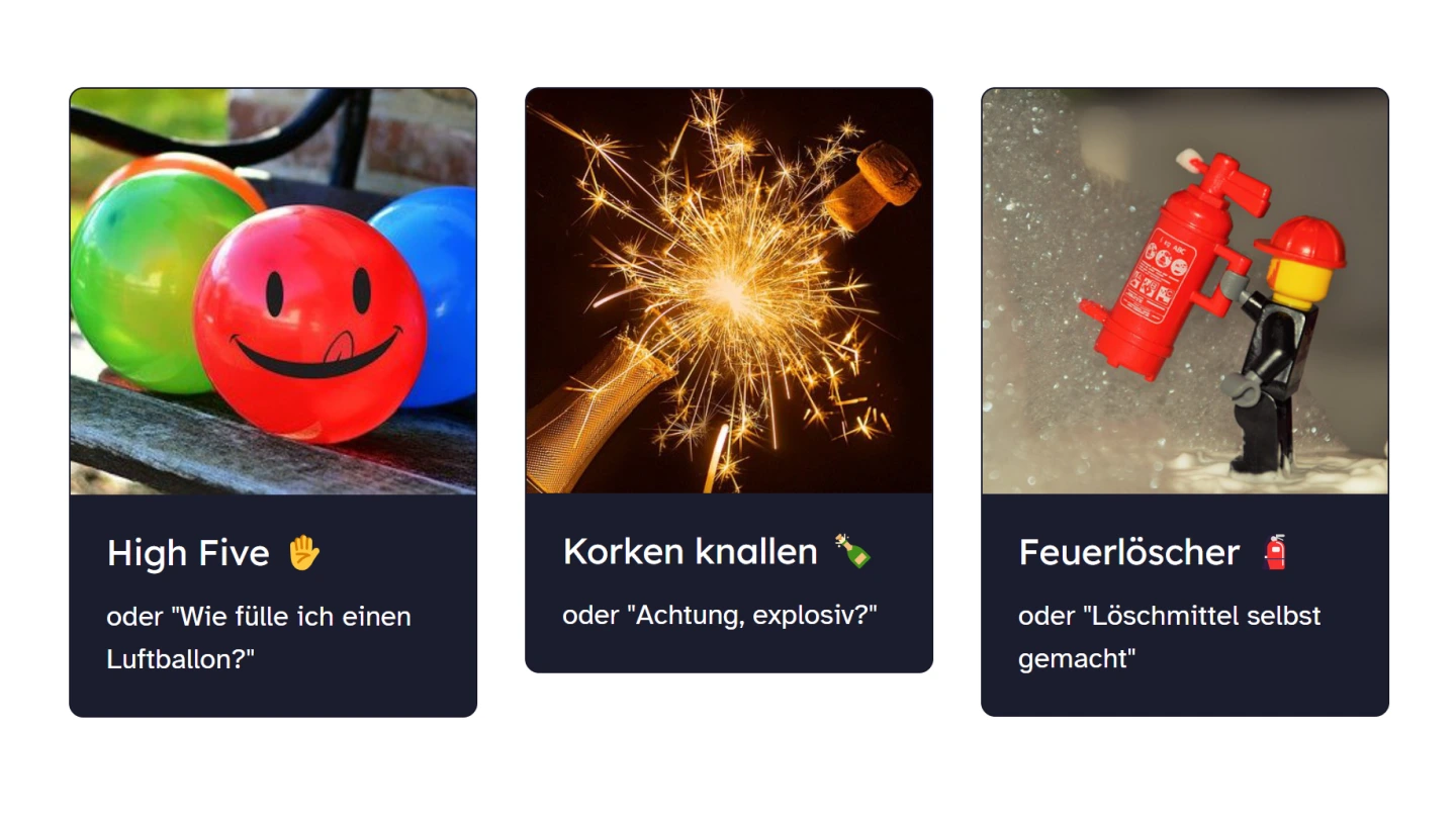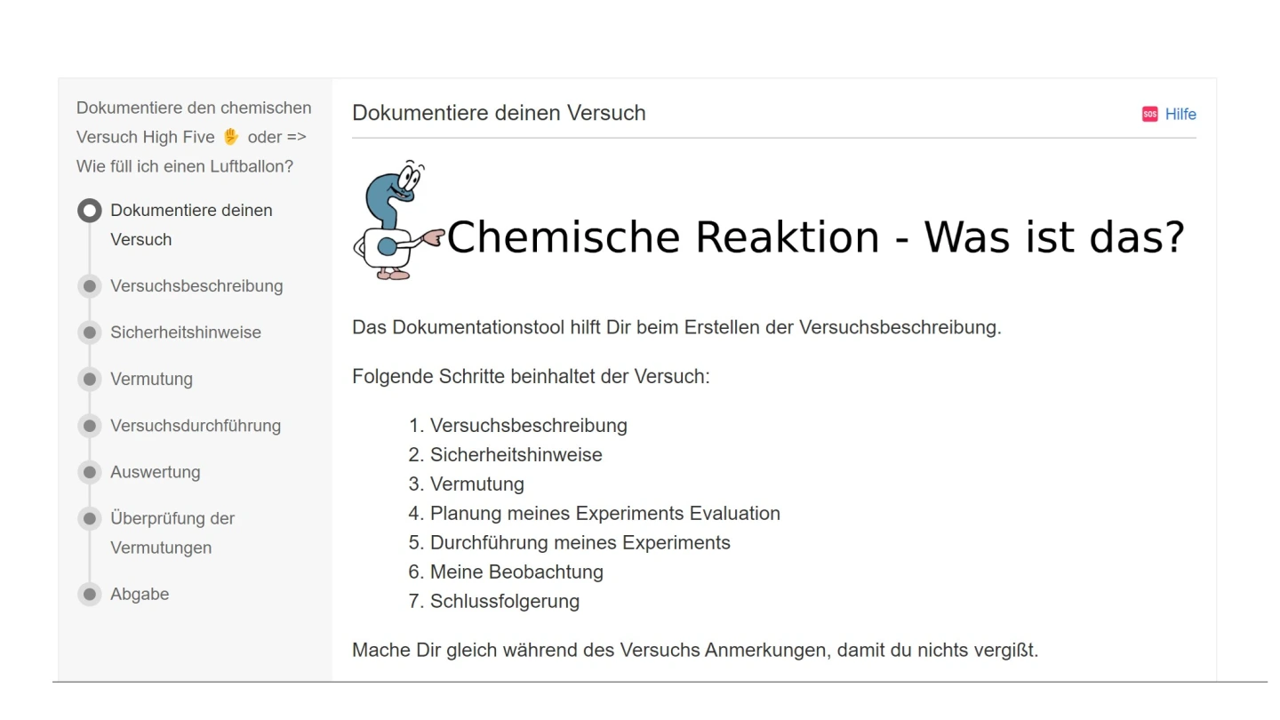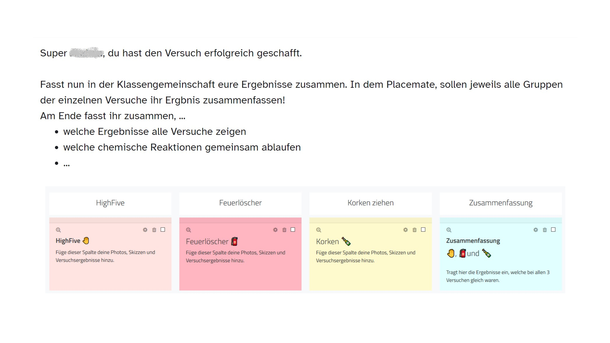 Die Schülerinnen und Schüler erhalten die Forscherfrage in Form eines Schülergesprächs (Video zur Motivation) sowie einen Versuch als Input (Schlange des Pharao). Sie erarbeiten durch die interaktive Aufgabenstellung eigenverantwortlich die Entstehung von Kohlenstoffdioxid bei chemischen Reaktionen. Dies aktiviert individuelles Vorwissen und vermittelt die Grundfertigkeiten. Anschließend wählen sie selbst einen Versuch aus (Korken knallen, Feuer löschen, Luftballon aufblasen), welcher die Gasentwicklung von Kohlenstoffdioxid (CO2) als ursächliche chemische Reaktion aufweist. Diesen führen sie durch und dokumentieren ihn digital im Kurs. Zum Abschluss präsentieren sie den Mitlernenden ihre Ergebnisse per digitaler Pinnwand und finden Gemeinsamkeiten der unterschiedlichen Versuche passend zur Forscherfrage.