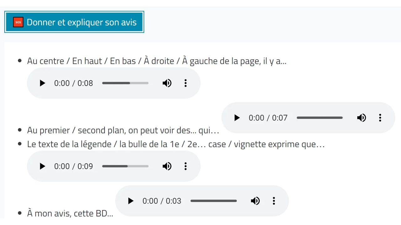 Schließlich erstellen die Schülerinnen und Schüler gemäß des Arbeitsauftrags ihre eigene BD. Dabei werden sie je nach Bedarf unterstützt durch zahlreiche Online-Tools, die ihnen im Sinne der Sprachreflexivität (siehe 1: La BD en France − Les conjugaisons − pas de problème?!) helfen, den eigenen Wortschatz zu erweitern und die korrekte Aussprache zu trainieren.