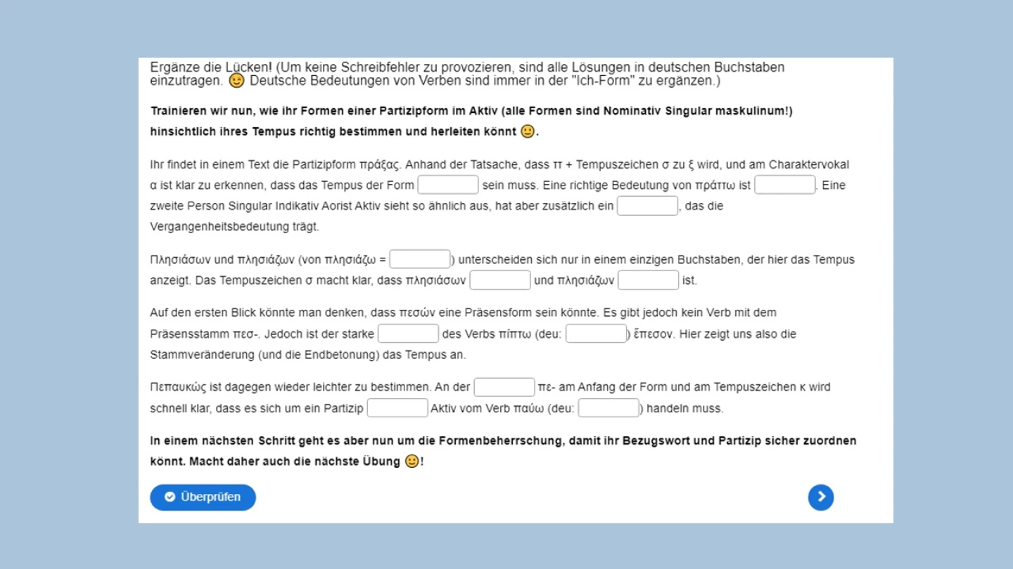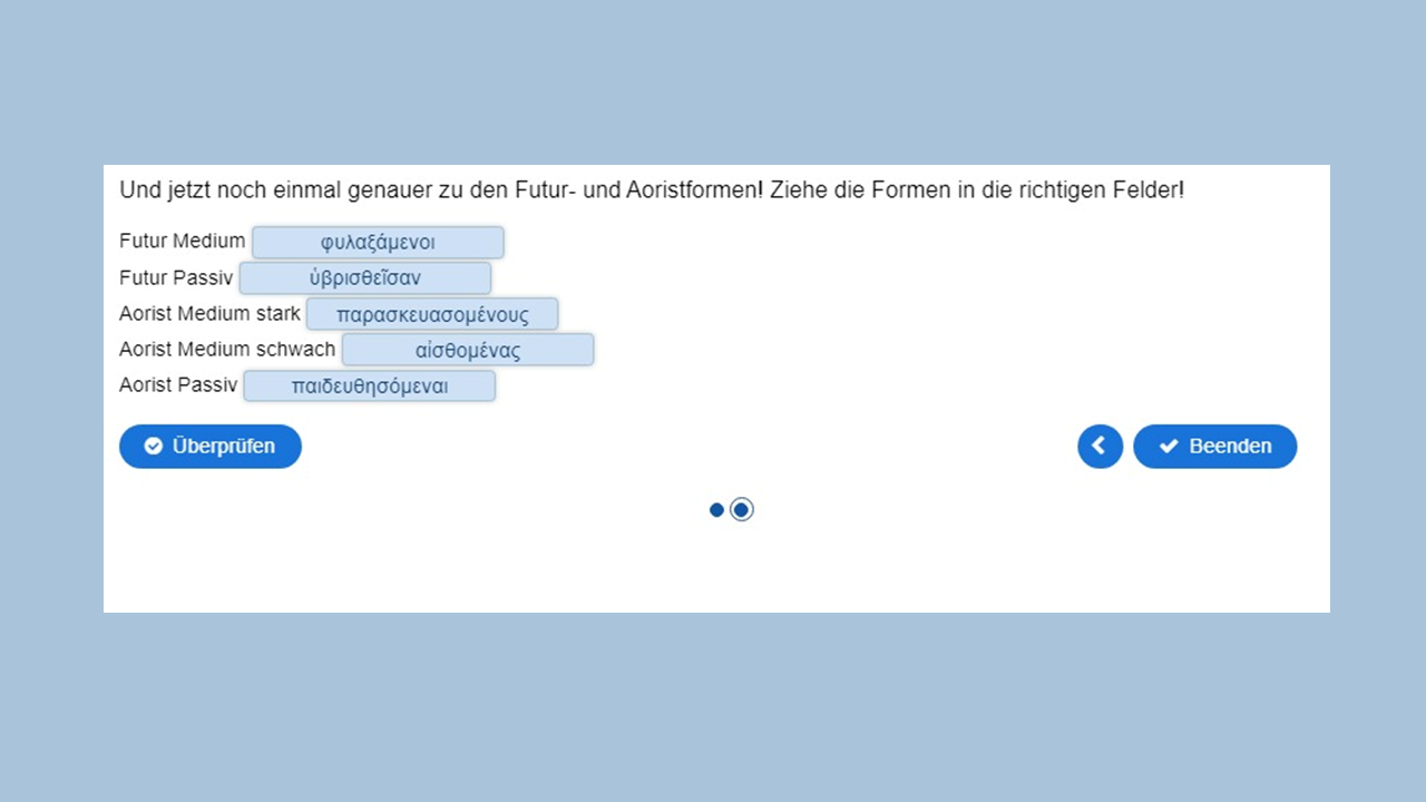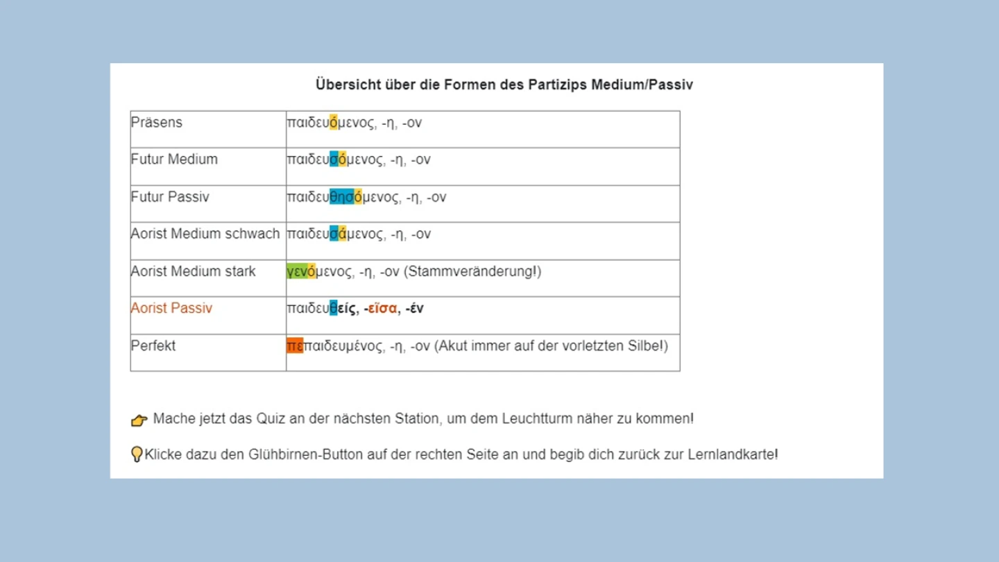 Diese Station bietet den Schülerinnen und Schülern eine detaillierte Übersicht über die Formenbildung des Partizips im Medium und Passiv in allen Zeitformen. Hier werden die theoretischen Grundlagen gelegt, die für die folgenden Übungen notwendig sind.