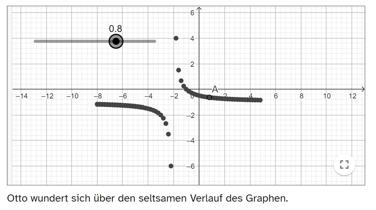 Mit Hilfe einer Geogebra-Aktivität untersuchen die Lernenden den Verlauf des Graphen der Funktion x↦(1/(x+2))-1 zunächst mithilfe von einzelnen geplotteten Punkten (im ersten Schritt in groben Schritten; anschließend verfeinert). Dabei wird ihr Augenmerk auf die Besonderheit an der Definitionslücke gelenkt und sie erkennen die senkrechte Asymptote. Die Lernenden formulieren dabei ihre Beobachtungen schriftlich. Durch das Zoomen des Funktionsgraphen in der Mathematiksoftware erkennen die Lernenden, dass der Funktions-Graph der Asymptote beliebig nah kommt, sie aber nie berührt oder schneidet. Sie formulieren zunächst selbst, wie sie anhand des Funktionsterms zu den Gleichungen der senkrechten und waagrechten Asymptote kommen. Im Anschluss werden diese Erkenntnisse mit Hilfe eines Lückentexts, der mit vorgegebenen Text-Bausteinen gefüllt wird, zusammengefasst.