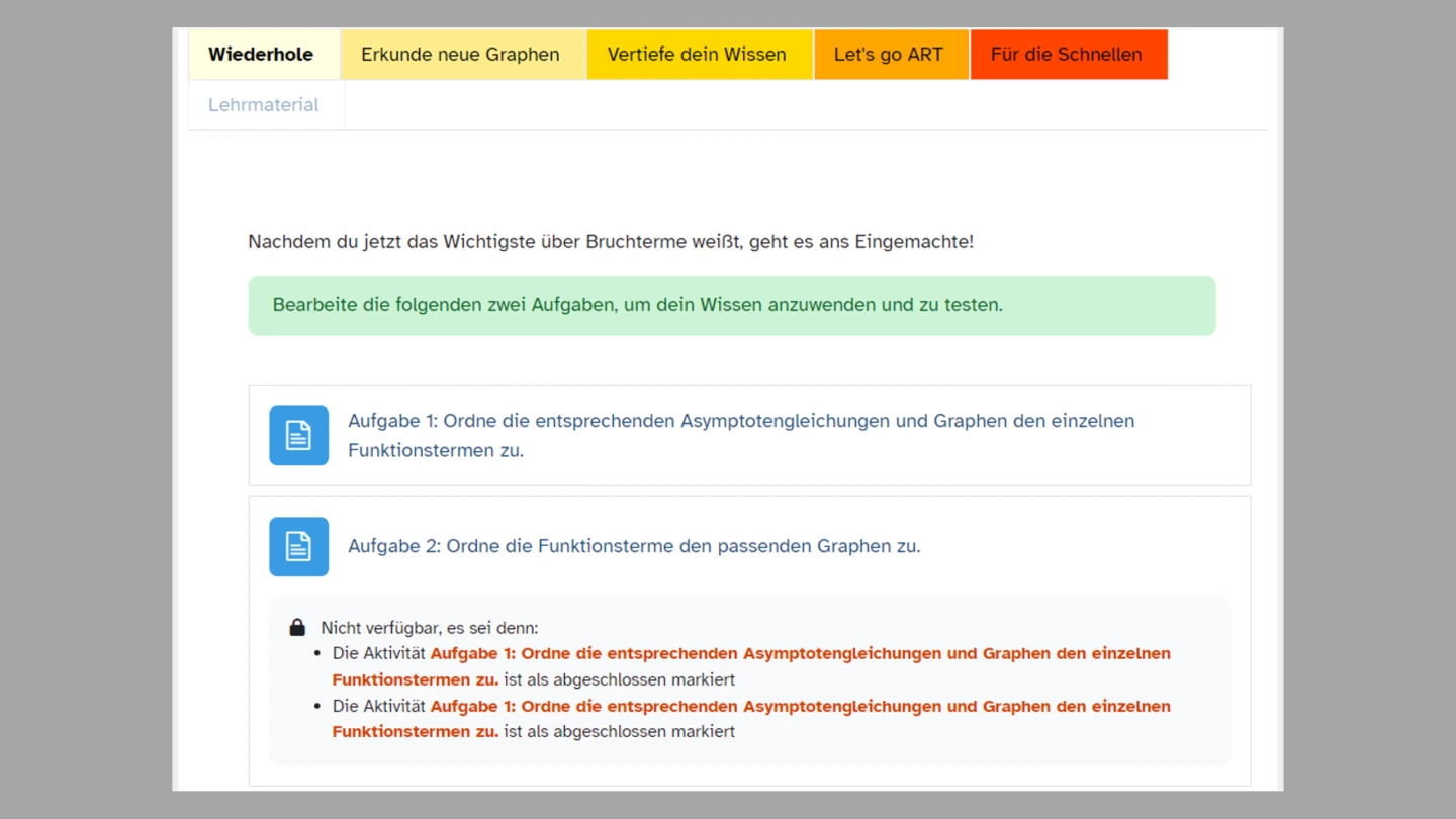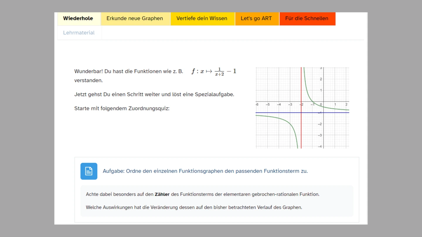 In der ersten Aufgabe erhalten die Schülerinnen und Schüler vier Funktionsterme und ordnen die zutreffenden Gleichungen der Asymptoten und im Anschluss den korrekten Graphen zu. Dadurch sollte am Ende der ersten Übung diese Zuordnung verankert sein.