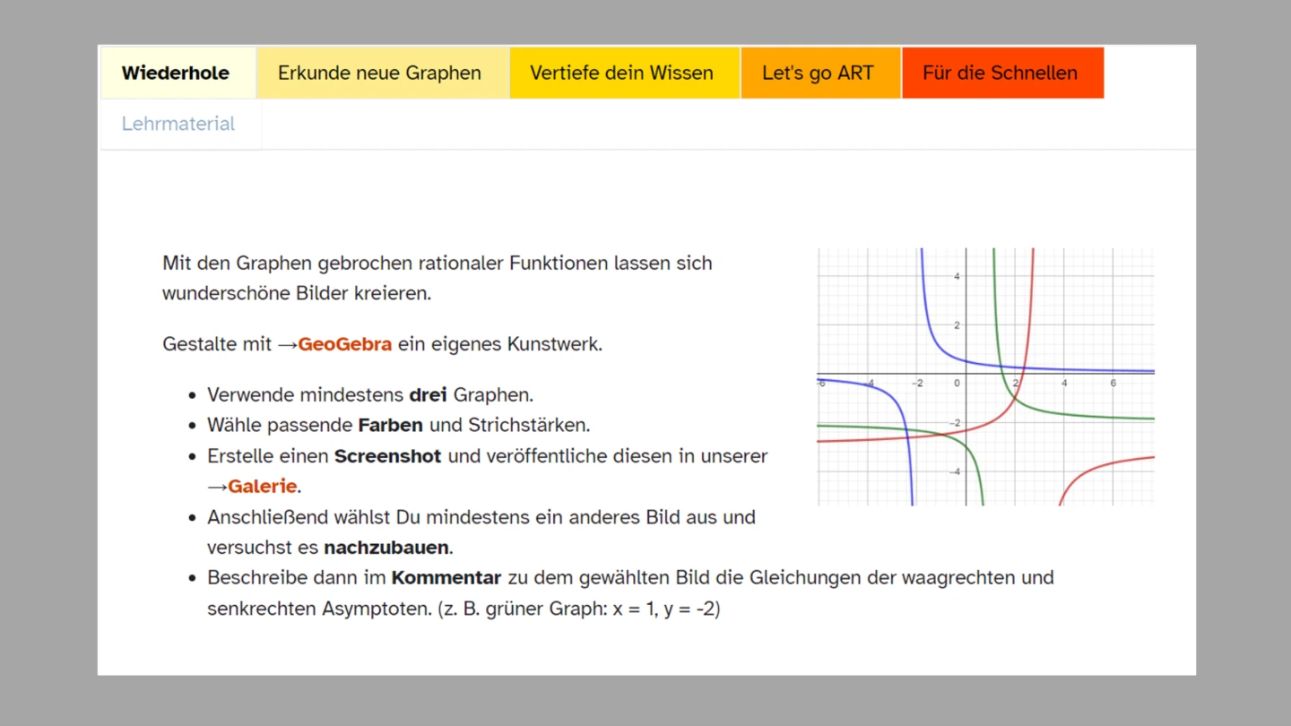 Der vierte Abschnitt erlaubt den Schülerinnen und Schülern, sich mit dem Thema kreativ und interaktiv auseinanderzusetzen. Sie erstellen in der Mathematiksoftware ein eigenes Graphen-Kunstwerk, welches sie in eine gemeinsame Galerie hochladen. Zudem entnehmen sie der Galerie ein Kunstwerk mit der Aufgabe, die Entstehung durch die eigene Anwendung der Mathematiksoftware nachzuvollziehen. Abschließend kommentieren sie das gewählte Kunstwerk mit den Gleichungen der Asymptoten oder gehen auf Kommentare von Mitschülerinnen und Mitschülern ein.