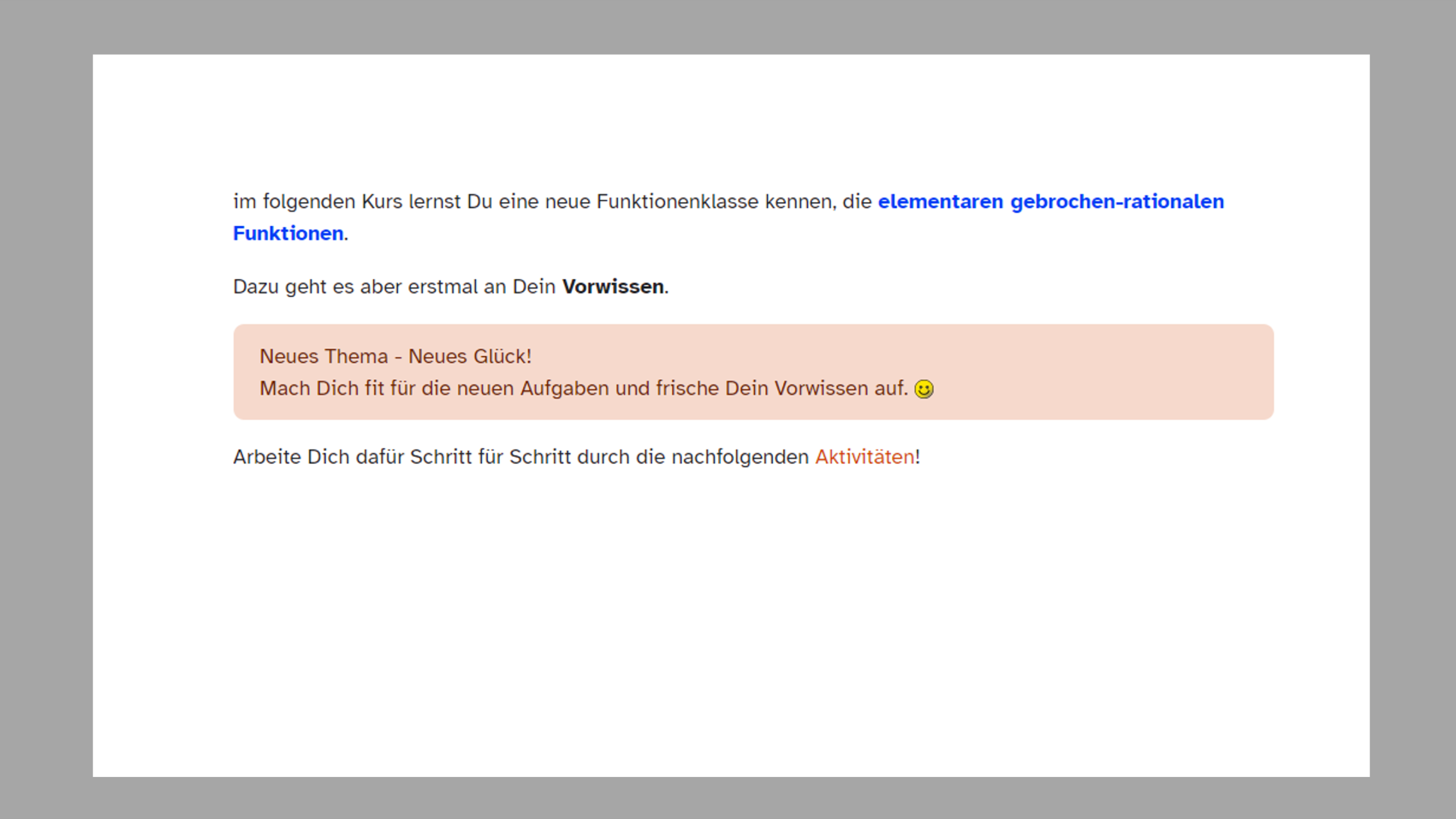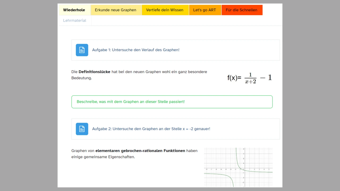 Zunächst aktivieren die Schülerinnen und Schüler in einer Auswahlübung ihre Kenntnisse über Definitionsmengen und insbesondere Definitionslücken. Sie füllen anschließend per Drag & Drop einen Lückentext aus und halten den entstandenen Text zur Einführung der neuen Funktionen-Klasse der gebrochen-rationalen Funktionen im Heft fest.