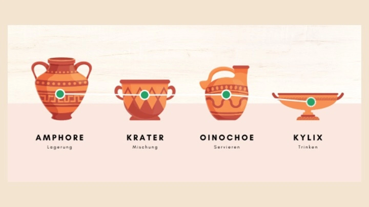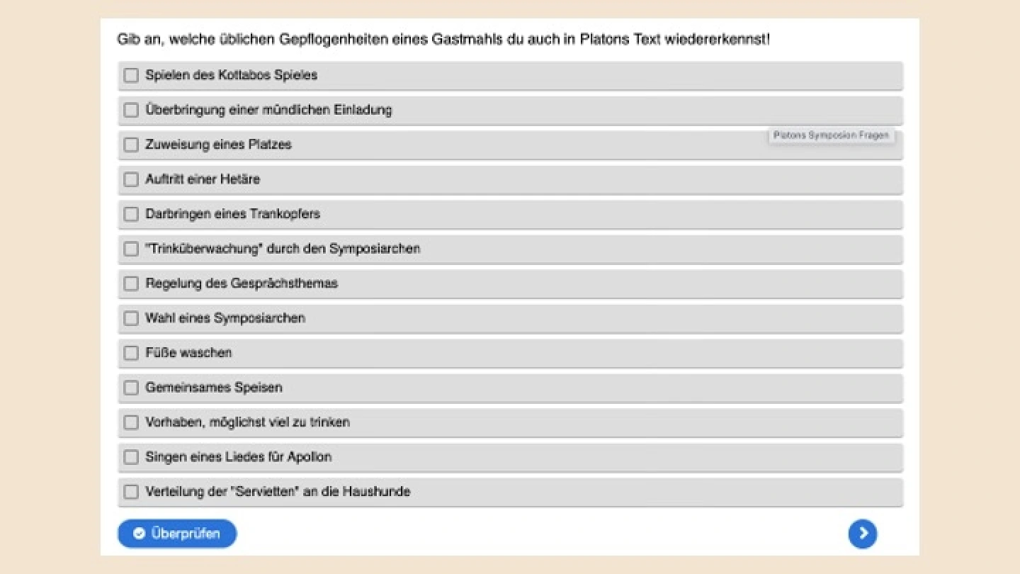 Anhand einer Lernlandkarte setzen sich die Schülerinnen und Schüler mit dem Thema „Symposion“ auseinander. Hierbei entdecken sie selbsttätig anhand von Bildern, einer Zeitleiste und durch einen Originaltext Platons, was zu einem Symposion dazugehörte und wie es ablief. Schließlich können die theoretischen Kenntnisse in die Praxis umgesetzt werden, indem die Schülerinnen und Schüler selbst ein Symposion veranstalten.