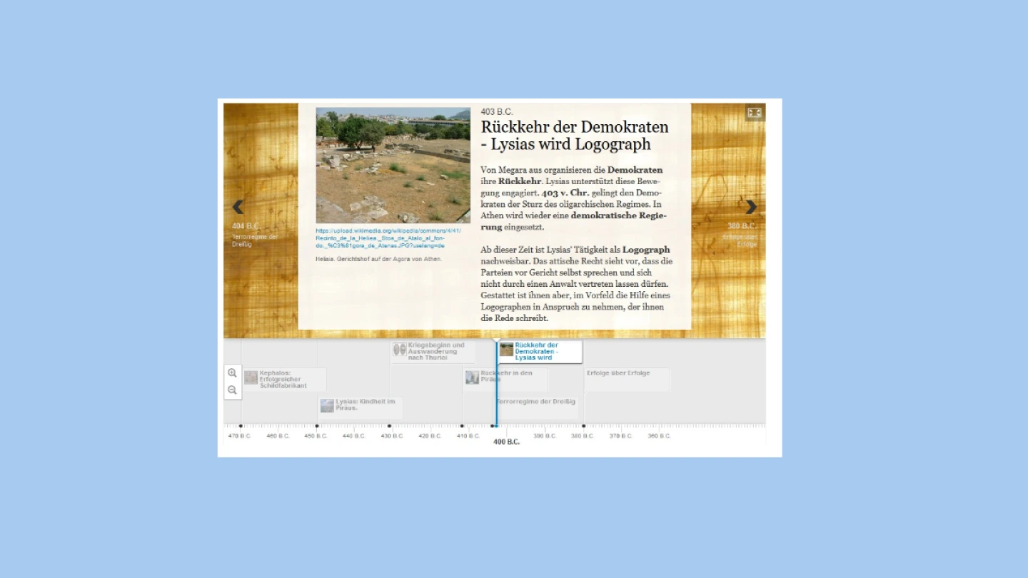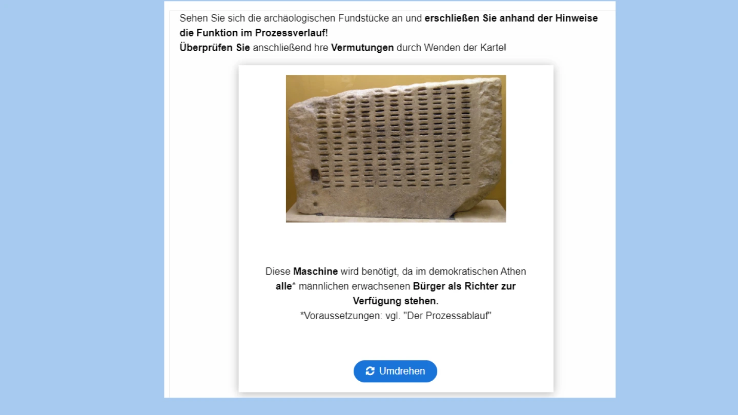 Zunächst machen sich die Schülerinnen und Schüler mit der Biographie des Redenschreibers Lysias im zeitgeschichtlichen Kontext vertraut. Die anschließende Beschäftigung mit Wesensmerkmalen der attischen Gerichtsbarkeit erleichtert ebenso das Verständnis der Rede. Auf der Differenzierung zwischen verschiedenen Tötungsdelikten liegt besonderes Augenmerk. Der Blick auf den eigentlich strittigen Punkt des vorliegenden Falls schließt den Kurs ab: Denn nicht, ob der Angeklagte Eratosthenes getötet hat, ist die Frage, sondern wie diese Tötung rechtlich einzustufen ist.