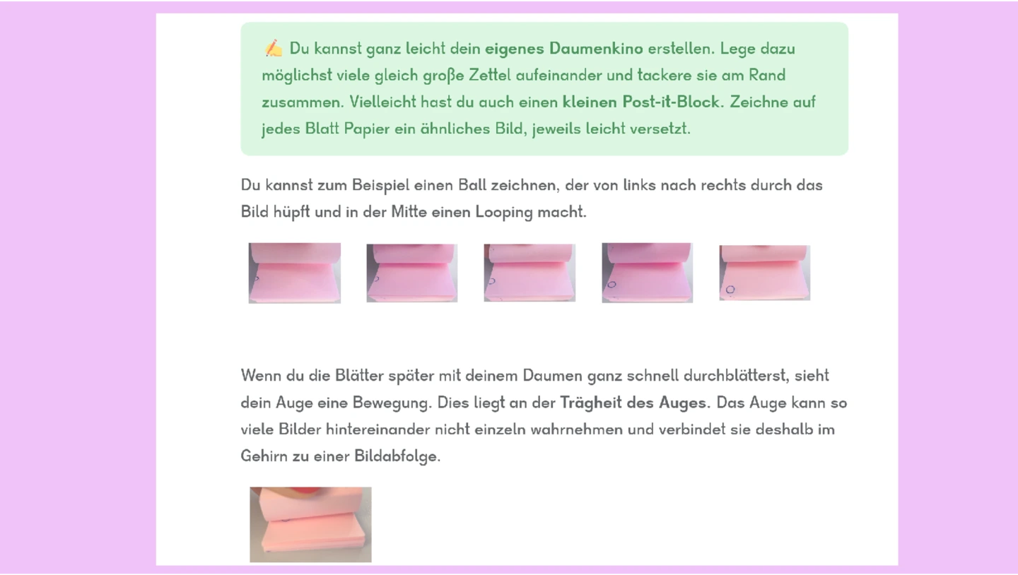 Im weiteren Verlauf lernen die Kinder den Begriff „Stopmotion-Film“ kennen, indem sie ein eigenes Daumenkino erstellen, damit sie das Prinzip der Trägheit des Auges verstehen. Auch diese Einheit kann sowohl in der Schule, als auch zu Hause bearbeitet werden und benötigt eine Unterrichtszeiteinheit.