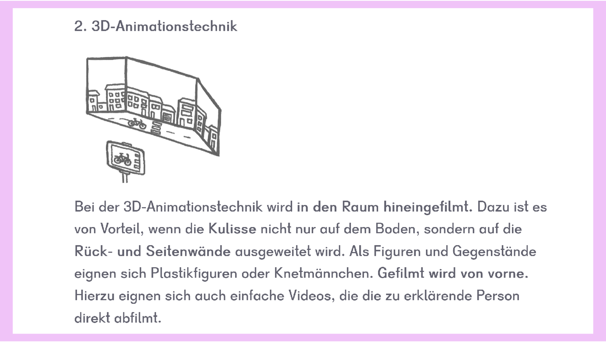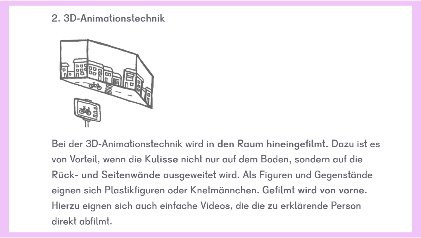 Im weiteren Verlauf gibt es eine Abstimmung zum Vorwissen zum Thema Daumenkino. Es folgt die Erklärung und die Ermutigung zur eigenständigen Gestaltung eines Daumenkinos mit Hilfe eines kleinen Post-it-Blocks. Nach einer Erklärung und der Herleitung des Begriffes Stopmotion werden vier verschiedene Arten von Erklärvideos aufgeführt.
