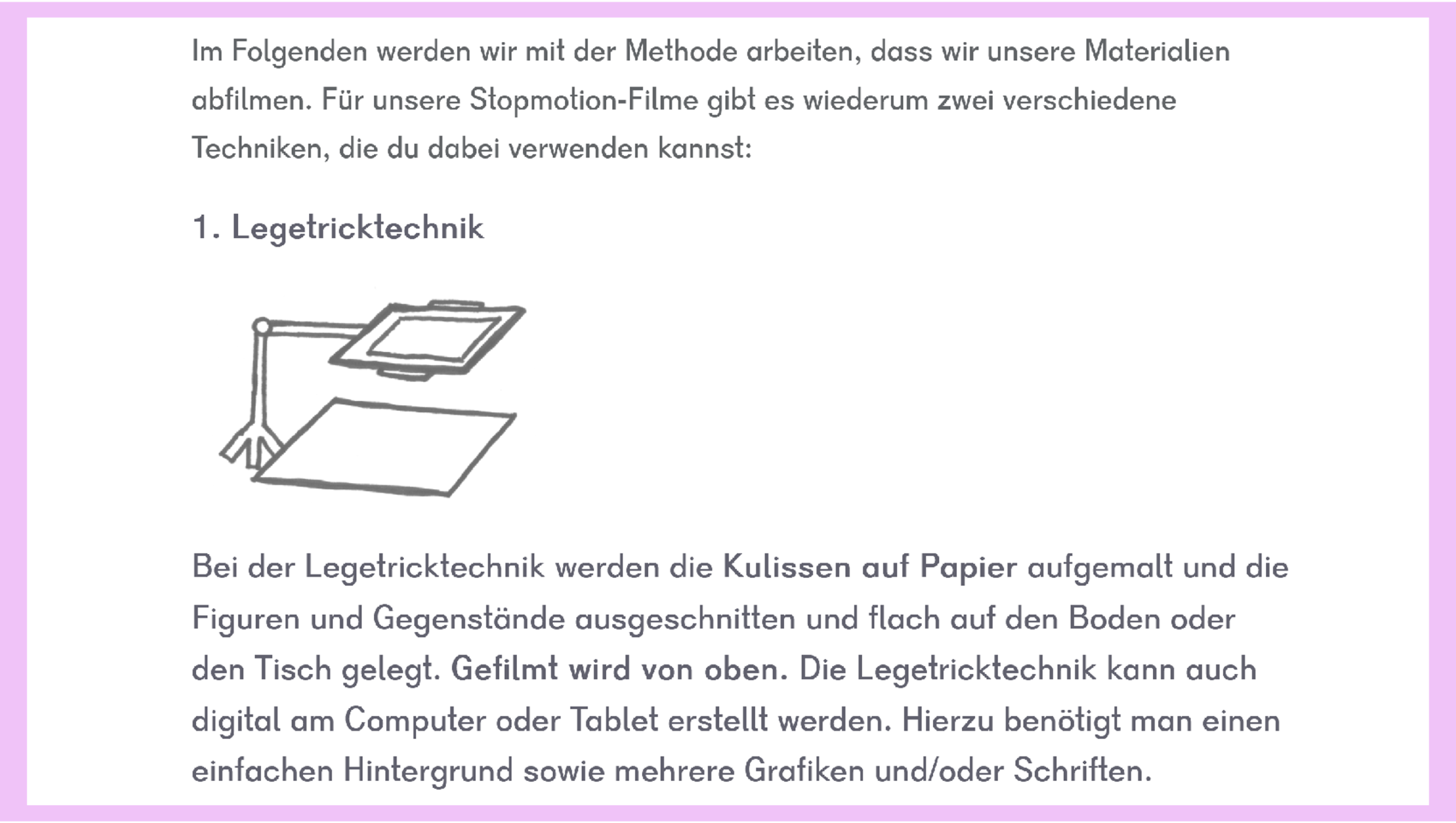 Darüber hinaus werden zwei Stopmotion-Techniken unterschieden, die die Kinder im Anschluss aktiv testen sollen. Hierfür benötigen sie ein Tablet, eine Software für Stopmotion-Filme sowie einen eigenen, selbstgewählten Gegenstand. Der Fantasie sind keine Grenzen gesetzt. Es folgt eine Abstimmung zur Reflexion der eigenen Stopmotion-Filme.