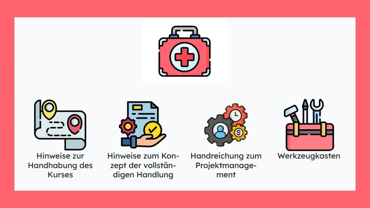 Die Lehrerhandreichung enthält Hintergrundinformationen zum didaktischen Grundkonzept, zur Idee des Social Entrepreneurships sowie zum Projektmanagement. Im Werkzeugkoffer finden Sie eine ausführliche Präsentation zum Projektmanagement mit erläuternden Hinweisen für die Lehrkraft in den Notizen, die Sie an Ihre Bedürfnisse anpassen können. Darüber hinaus sind für jeden Arbeitsschritt konkrete Umsetzungshinweise in einer blauen Box hinterlegt.