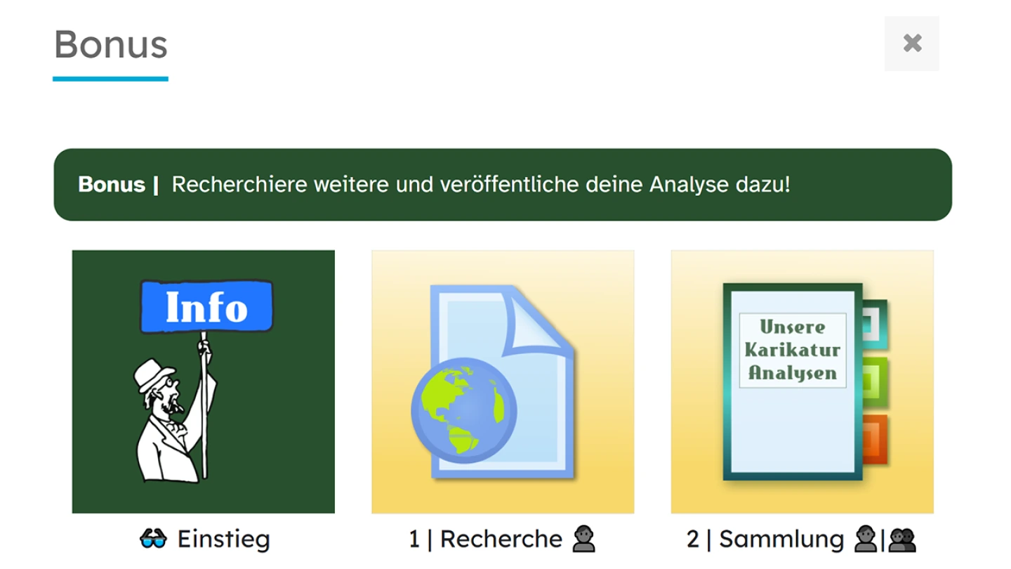 Die letzte Phase dient der Festigung der erworbenen Kompetenzen. Die Lernenden wählen ein eigenes Wahlplakat aus und erstellen ohne Hilfestellung eine Karikaturanalyse. Die Veröffentlichung findet im Rahmen der Lerngruppe statt. Auch hier ist ein Peer-Feedback eingeplant. Zur Unterstützung erhalten die Lernenden lediglich Informationen zu seriösen Quellen für ihre Recherche zu geeigneten Bildquellen. Diese Phase kann auch außerhalb des (Präsenz-)unterrichts stattfinden.