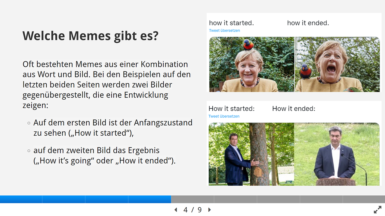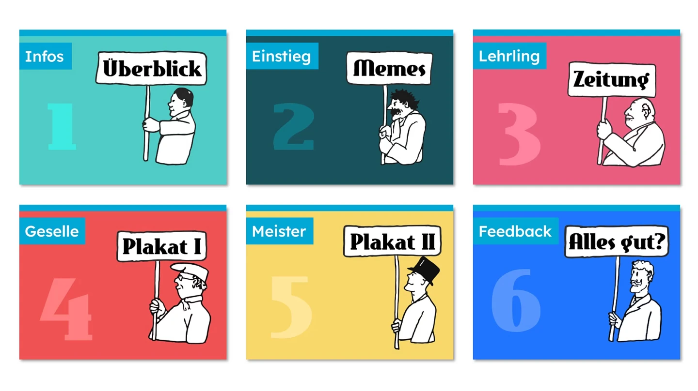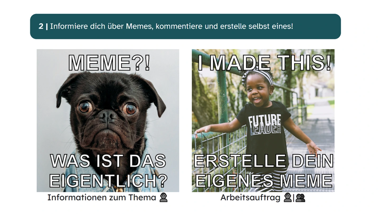 Die Lernenden erarbeiten sich anschließend in Einzelarbeit das Phänomen der Internet-Memes und erstellen selbst ein Meme zum Thema „Weimarer Republik”. Das anschließende Peer-Feedback dient der Einübung des Feedback-Gebens. Dieser Abschnitt bzw. dessen Abschluss könnte auch außerhalb des (Präsenz-)Unterrichts stattfinden.