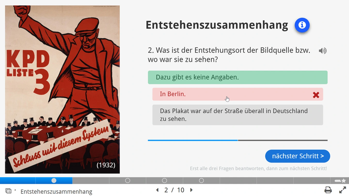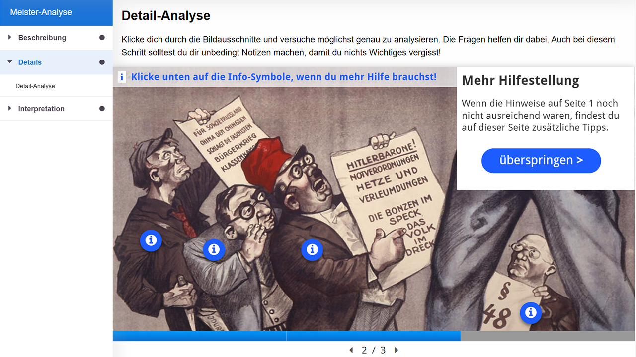 Die zweite Karikaturanalyse hat ein Wahlplakat der NSDAP zum Gegenstand, das sehr ähnlich aufgebaut ist wie das aus der vorhergehenden Phase. Die Lernenden können ihre bereits erworbenen Kompetenzen anwenden, erhalten - bei Bedarf - aber trotzdem zusätzlich Unterstützung. In der Produktion des Ergebnisses steht den Lernenden eine weitere, komplexere Möglichkeit zur Verfügung. Auch das Feedback ist nochmals differenzierter angelegt: Zusätzlich zum Produkt-Feedback ist auch ein Feedback zum Kompetenzerwerb angelegt.