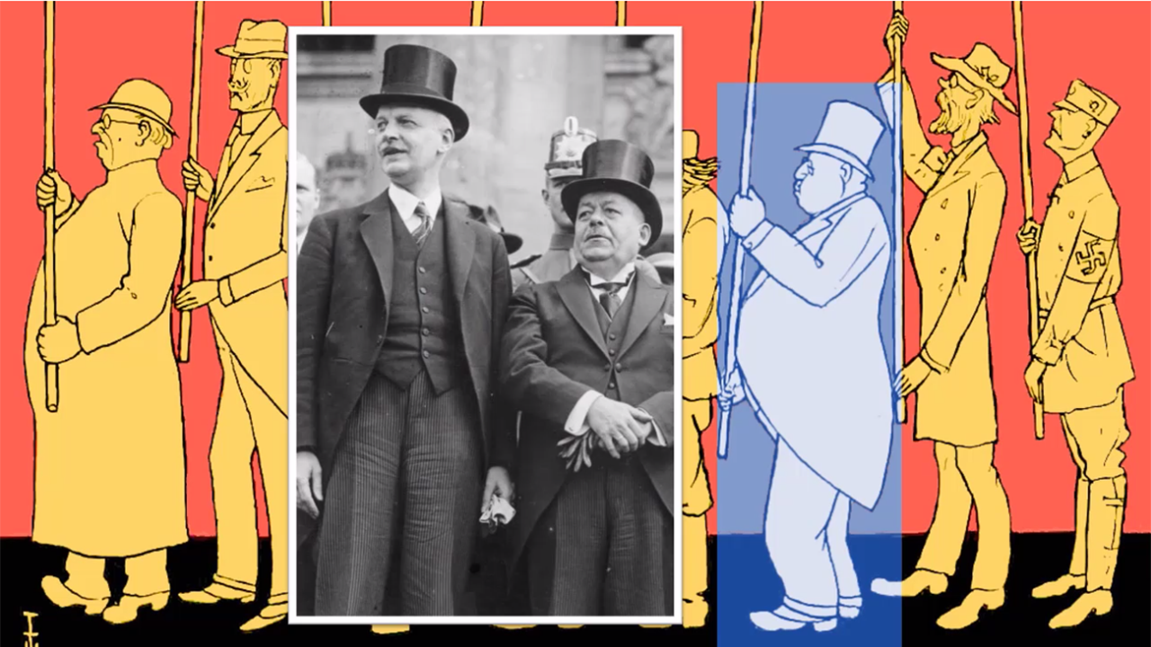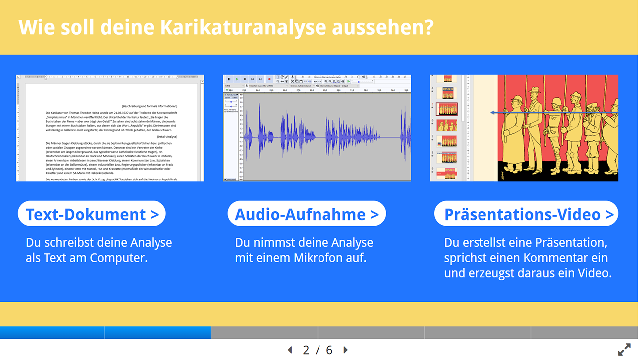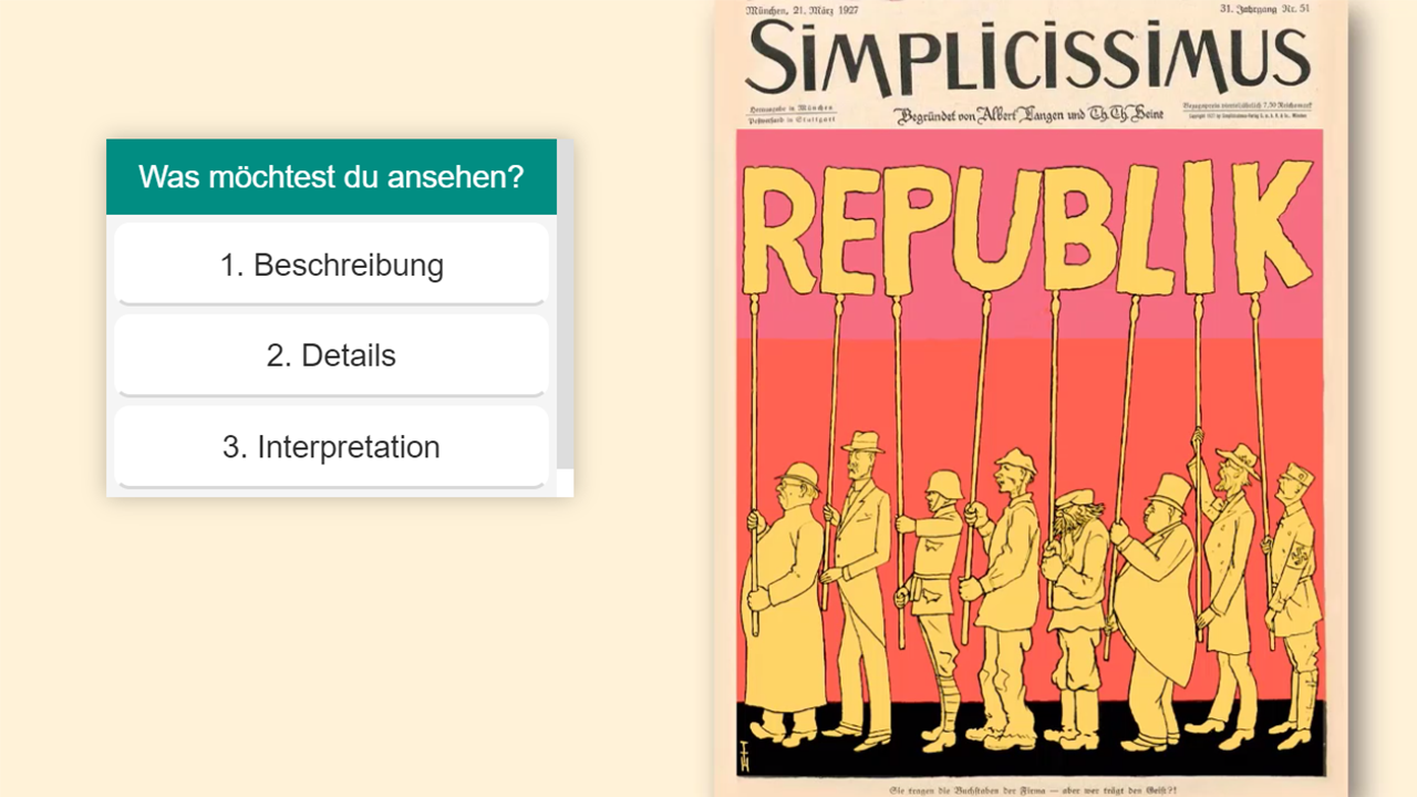 Mit dieser Phase beginnt der Kern des Kurses. Die Lernenden befassen sich eigenständig mit einer Musterlösung zur Karikatur des Themas Republik aus dem Simplicissimus. Sie erfahren, wie ein Profi bei der Analyse vorgeht und wie das Arbeitsergebnis aussehen könnte. Die Erarbeitung könnte im Sinne der Methode Flipped Classroom auch vollständig in die häusliche Vorbereitung verlagert werden.