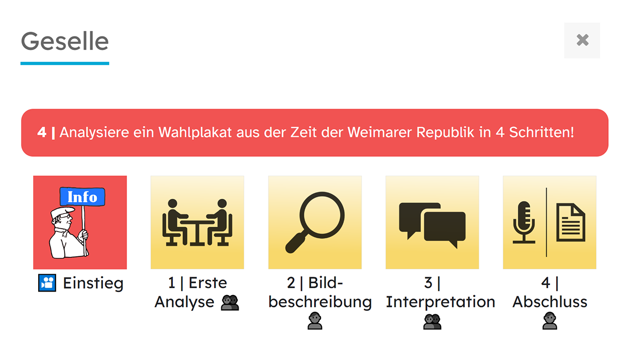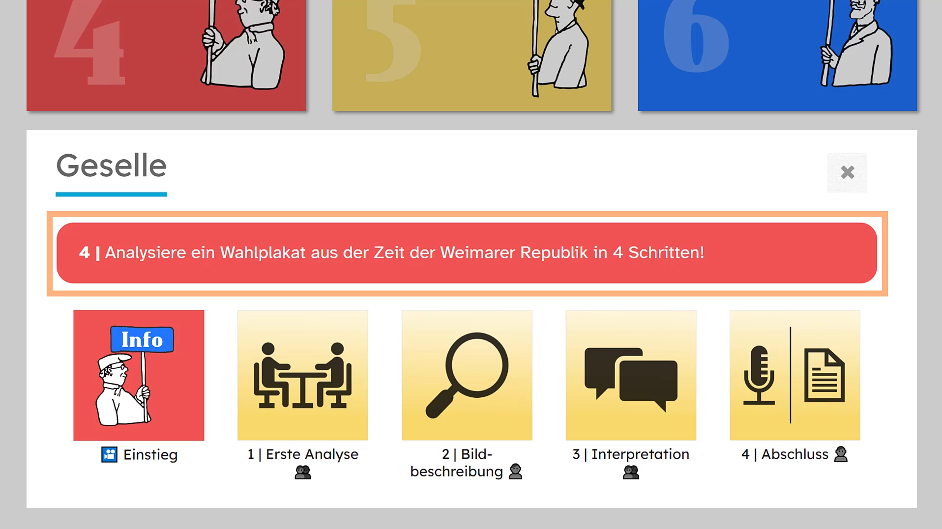 In dieser Phase analysieren die Lernenden ein Wahlplakat der KPD. Dabei erhalten sie sehr viele Zusatzinformationen und werden Schritt für Schritt durch den Prozess geleitet. Gerade in dieser Phase ist eine starke Begleitung durch die Lehrkraft sinnvoll. Die Durchführung erfolgt bestenfalls im Präsenzunterricht. Die Lernenden arbeiten sowohl in Partnerarbeit als auch streckenweise alleine. Am Ende steht eine Veröffentlichung der Ergebnisse mit kriteriengeleitetem Peer-Feedback.