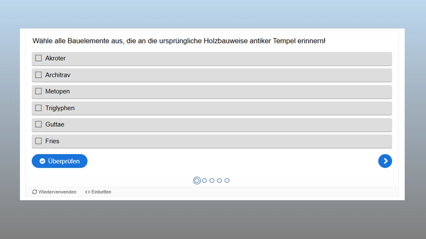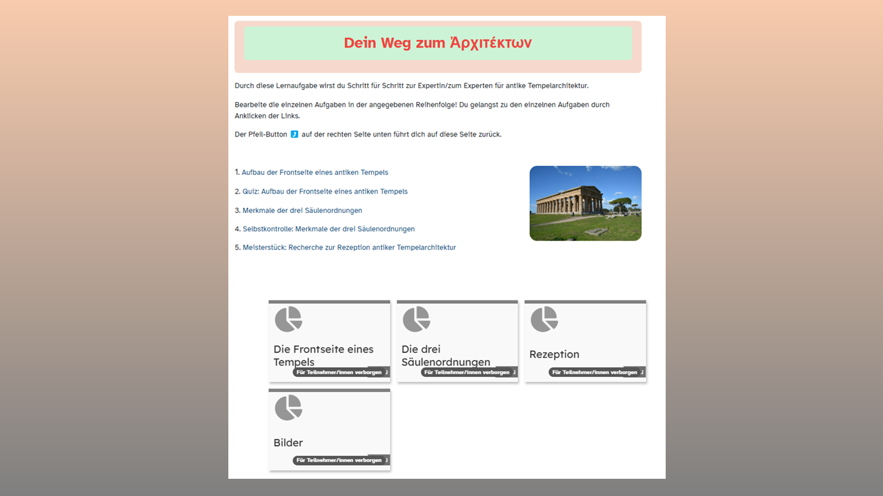 Die ersten vier Aufgaben (ca. 1 UE) vermitteln das erforderliche Sachwissen zu den Hauptelementen einer antiken Tempelfront und zu den drei Säulenordnungen.