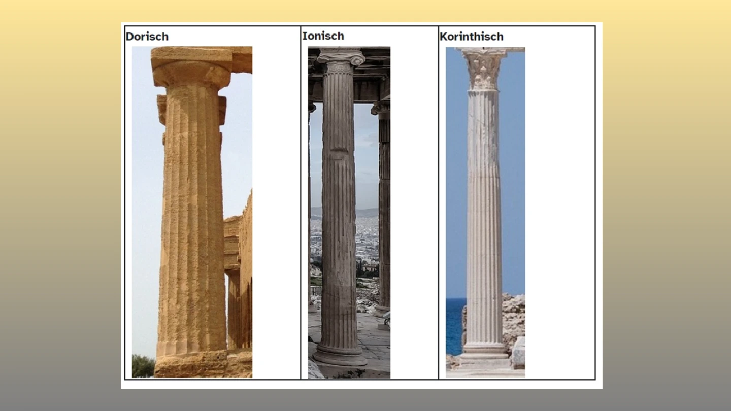3. Textseite: Abbildungen von Säulen der drei Säulenordnungen – Die Lernenden erschließen sich durch Beobachtung und Vergleich die jeweiligen Merkmale der drei Säulenordnungen.