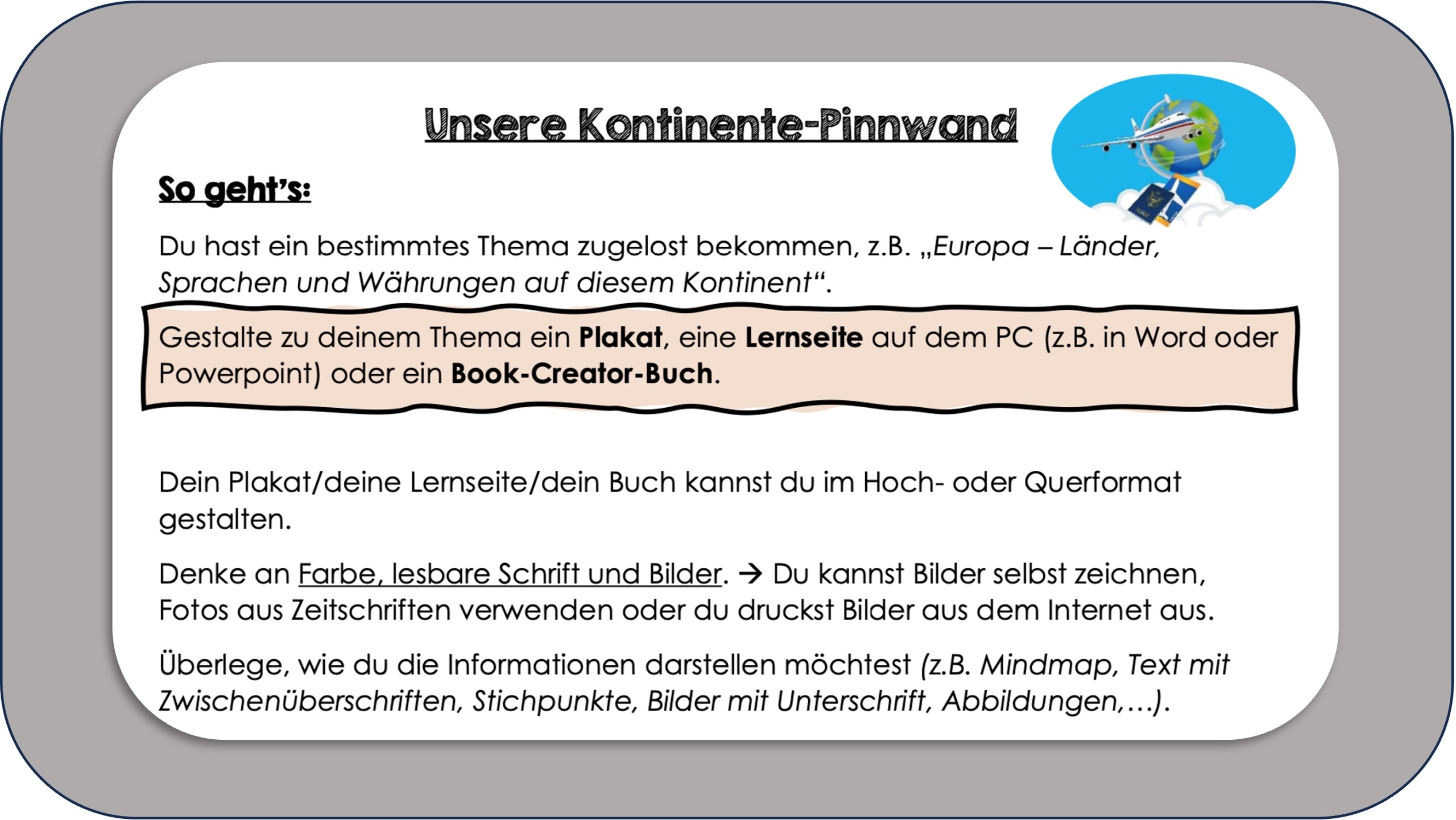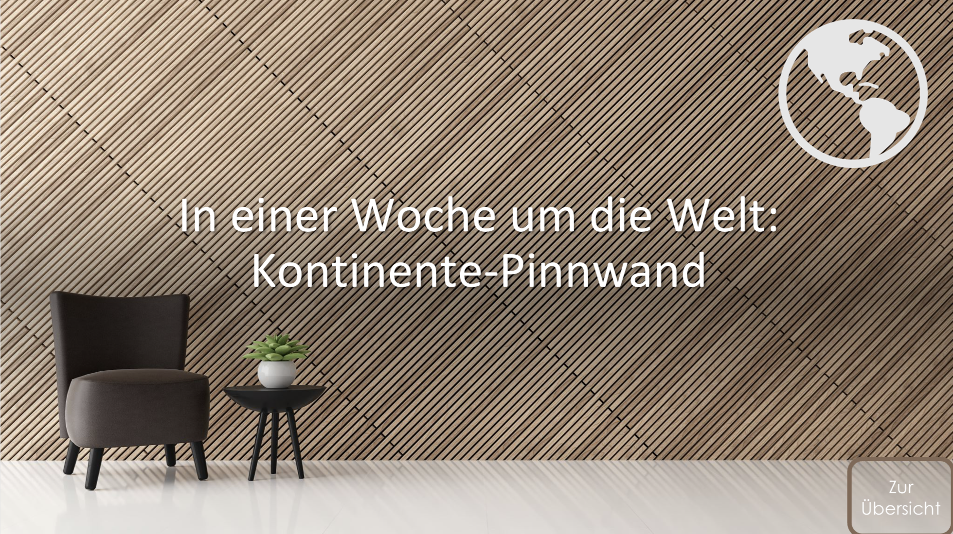 Das pdf- Dokument „Anleitung zur Erstellung einer Kontinente-Pinnwand” enthält organisatorische Hinweise und Informationen zu den notwendigen Umsetzungsschritten dieser Aufgabe.