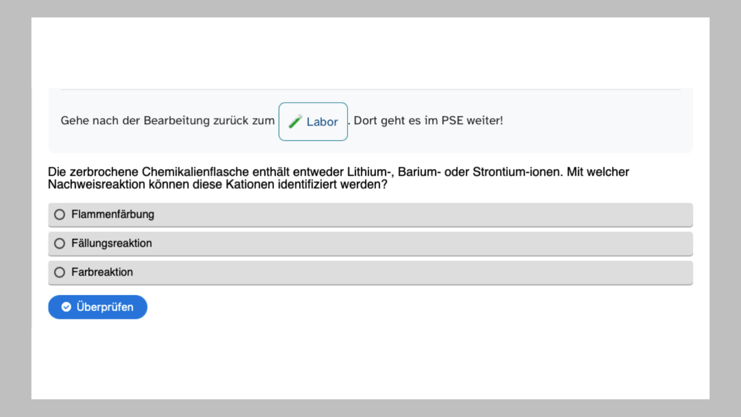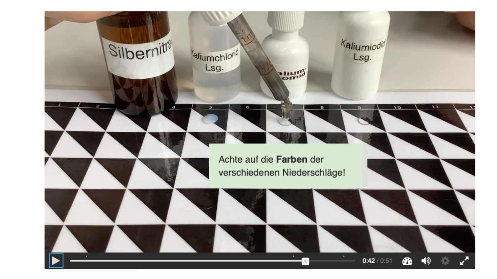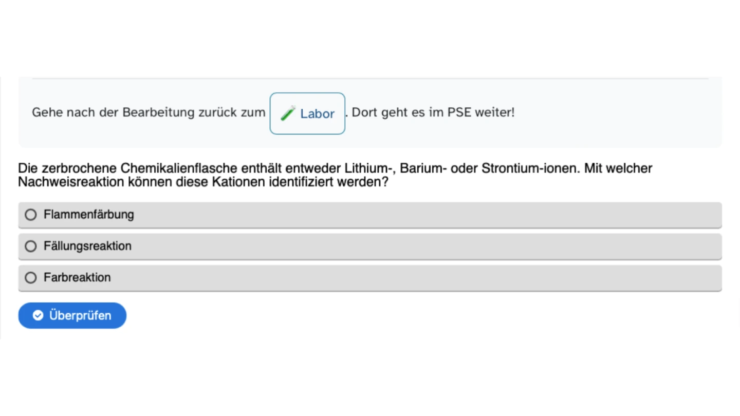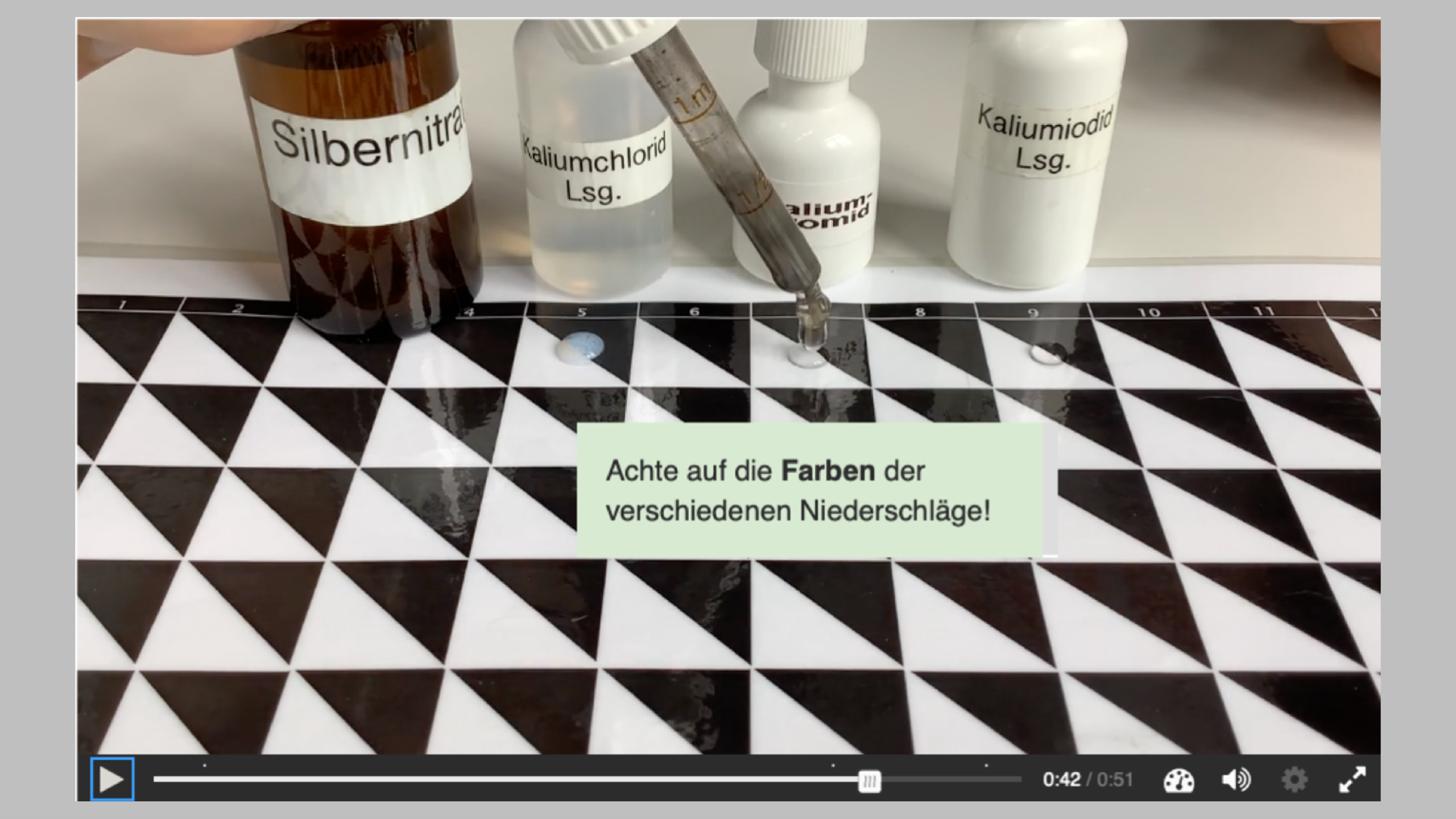 Ausgehend von einem „Laborunfall“ ist ein unbekanntes Salz zu analysieren. Hierbei müssen das Halogenid-Anion per Fällungsreaktion und das Metall-Kation mittels Flammenfärbung bestimmt werden.