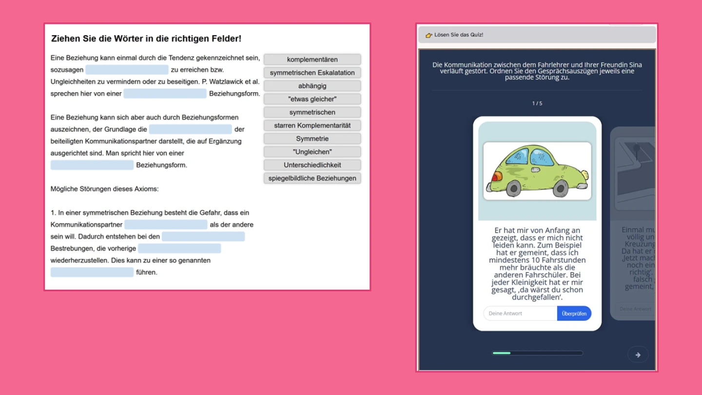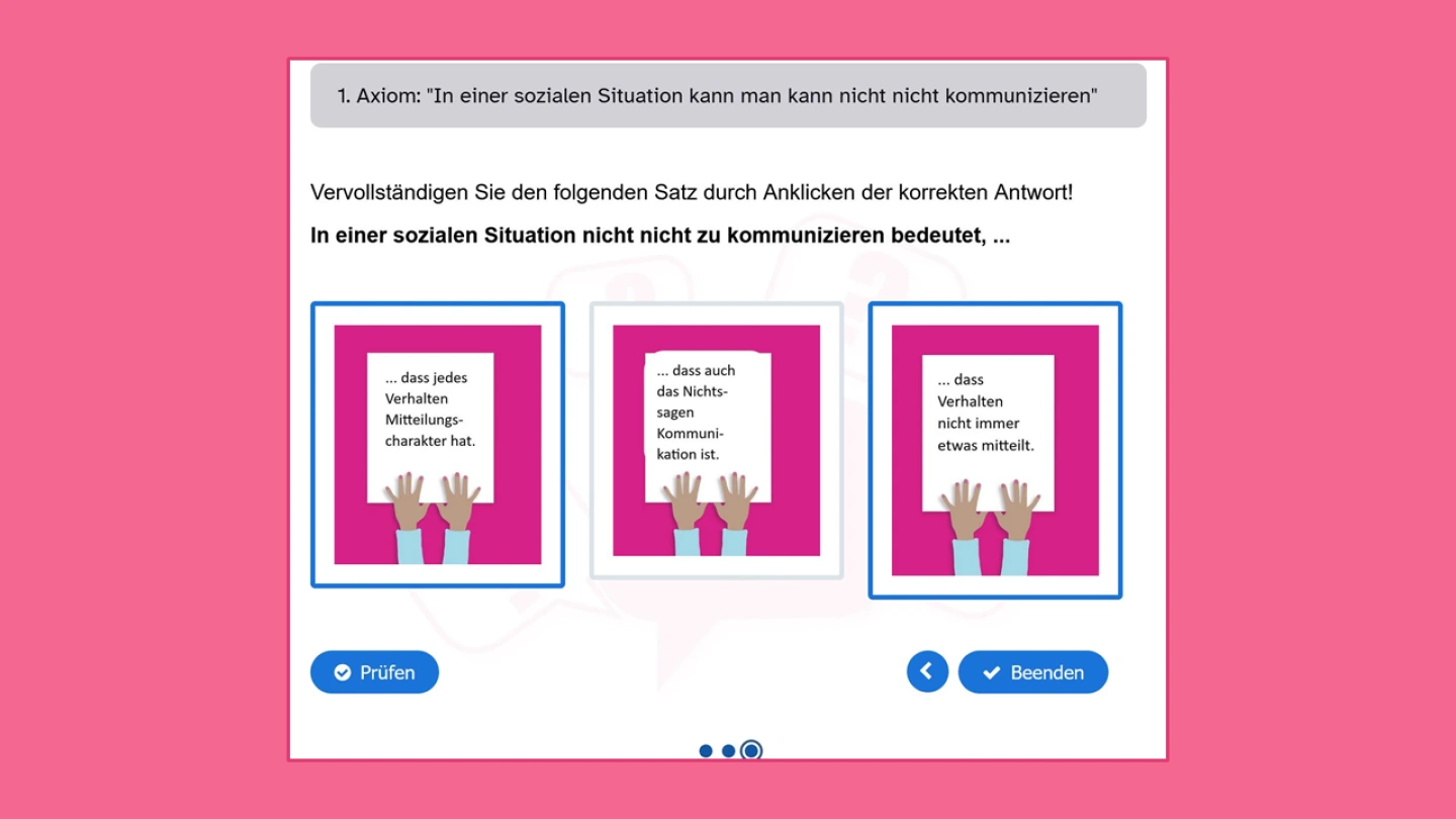 Der Kurs bietet unterschiedliche Möglichkeiten, den Schülerinnen und Schülern Übungsaufgaben zum Thema Grundsätze der Kommunikation nach Paul Watzlawick et al. anzubieten. Konkret handelt es sich um Festigungs- und Anwendungsaufgaben.
