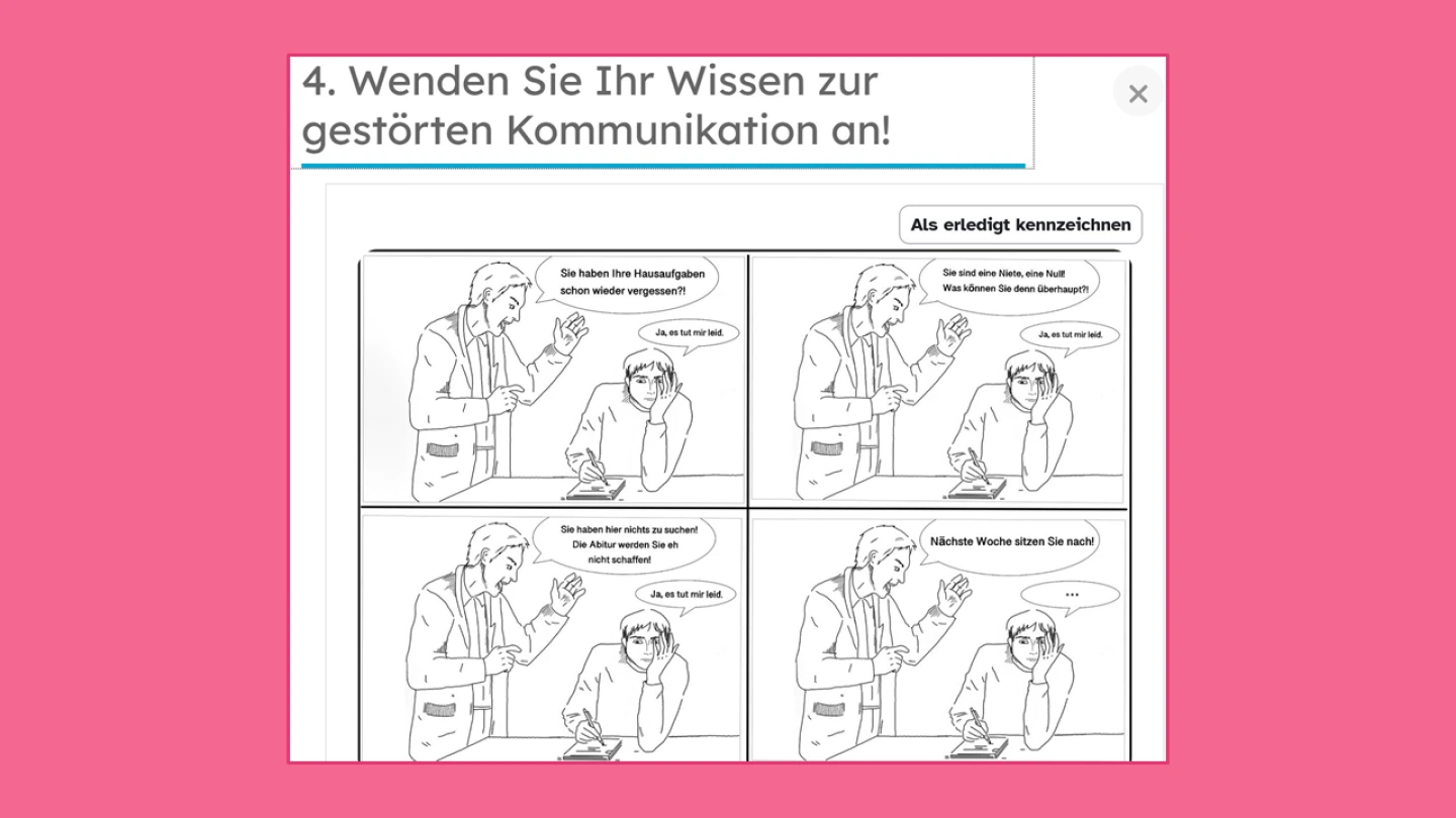Daran anschließend können die Schülerinnen und Schüler das vertiefte Wissen anwenden, in dem sie anhand eines Cartoons die dort dargestellten Kommunikationsstörungen herausarbeiten.