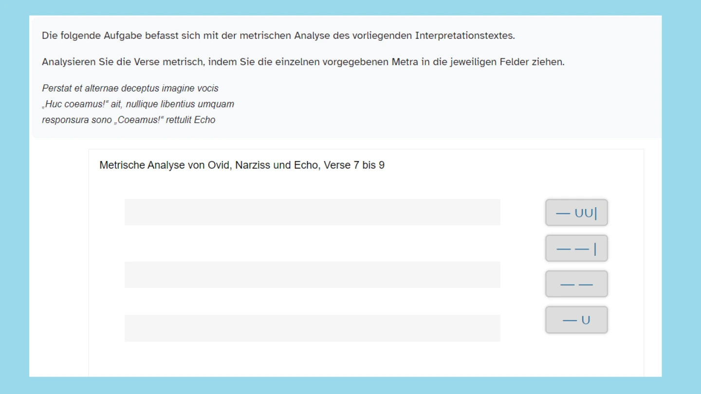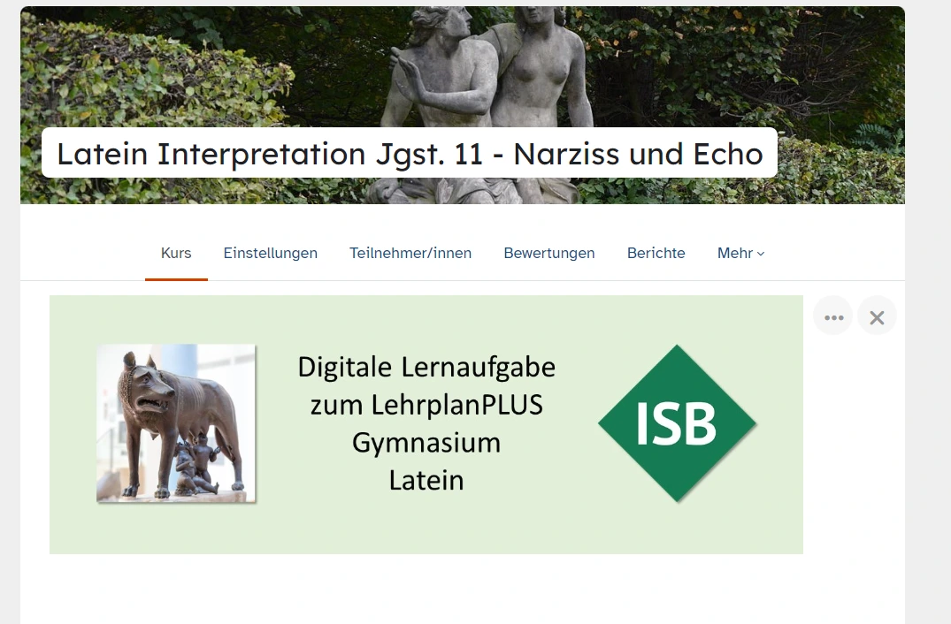 Der Kurs bietet verschiedene Aufgabenformate, in denen die Schülerinnen und Schüler sich schrittweise eine Interpretation eines Ausschnitts der Episode von Narziss und Echo erarbeiten. Sie arbeiten Gliederung, Gedankenführung und zentrale Aussagen eines Ausschnitts aus Ovids Metamorphosen heraus. Im Austausch mit ihren Klassenkameradinnen und –kameraden geben sie am Ende angemessenes Feedback.
