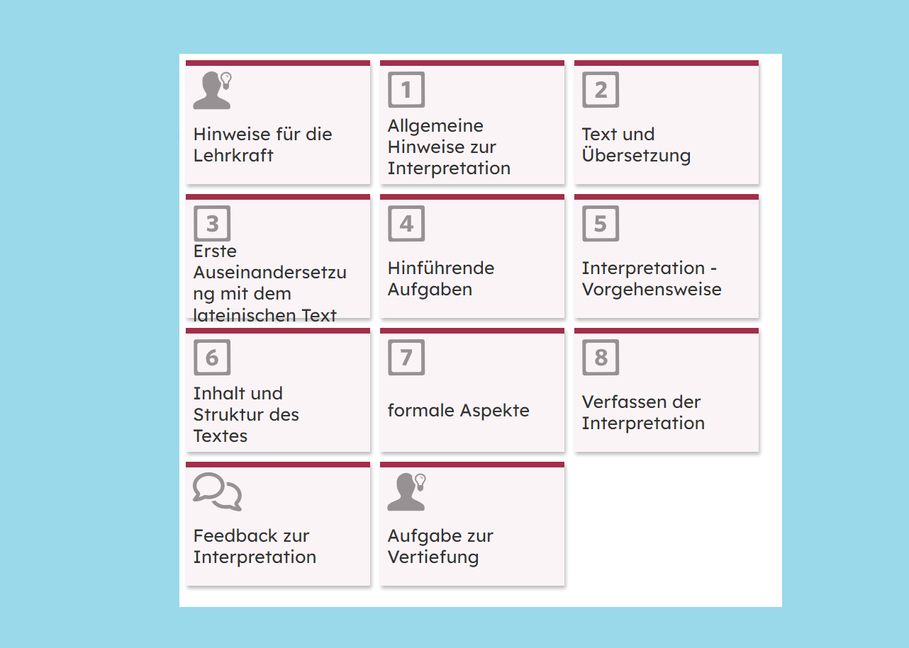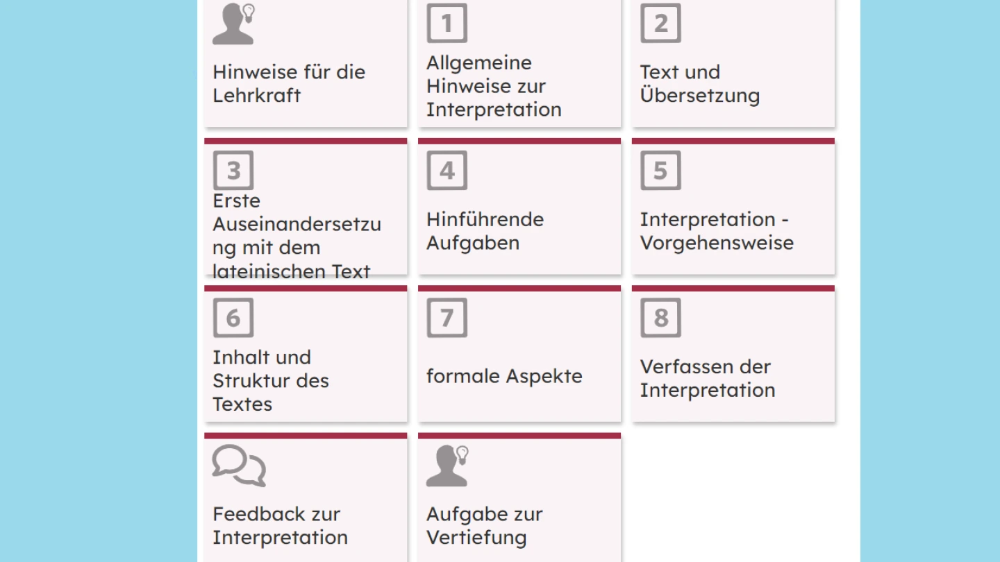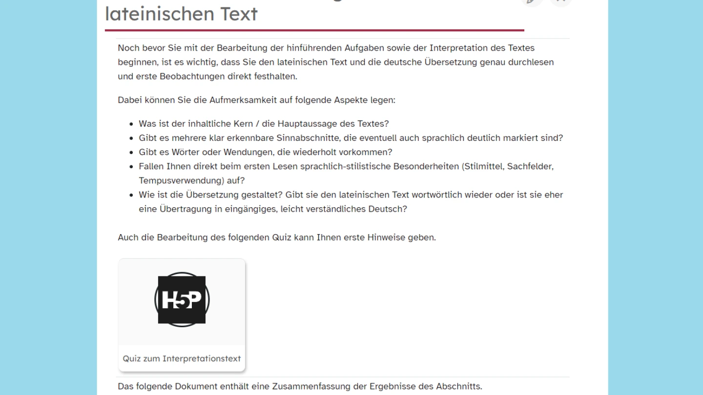 Im Abschnitt 3 erfolgt eine erste Auseinandersetzung mit dem lateinischen Text, wobei neben Hinweisen zum Vorgehen auch ein Quiz zur Verfügung gestellt wird. Der folgende Abschnitt 4 enthält unterschiedliche hinführende Aufgaben, von denen die Schülerinnen und Schüler diejenigen auswählen sollen, die sie für sich als sinnvoll erachten. Dabei wird neben allgemeinen Informationen zu Ovid und den Metamorphosen auch eine Auffrischung der Stilmittel gegeben. Der fünfte Abschnitt enthält Vorschläge zur Vorgehensweise bei der Interpretation. Es folgt ein Abschnitt zu Inhalt und Struktur des Textes, in dem die Lernenden diese Aspekte anhand einer Aufgabe erarbeiten. Der Abschnitt zu den formalen Aspekten des Textes beschäftigt sich sowohl mit der sprachlich-stilistischen Gestaltung als auch mit der Metrik. Im folgenden Abschnitt zum Verfassen der Interpretation werden wiederum Hinweise zu den Inhalten und zum Aufbau einer Interpretation gegeben. Auch wird den Schülerinnen und Schülern eine Beispiel-Interpretation zur Verfügung gestellt. Die verfassten Interpretationen sollen im Anschluss im Abschnitt „Feedback zur Interpretation“ hochgeladen werden. Dazu erhalten die Lernenden außerdem den Auftrag, auch zu mindestens einer Interpretation der Mitschülerinnen und Mitschüler ein Feedback abzugeben. Im letzten Abschnitt wird eine Aufgabe zum Vergleich der Beispiel-Interpretation mit einer von einer KI generierten bereitgestellt.