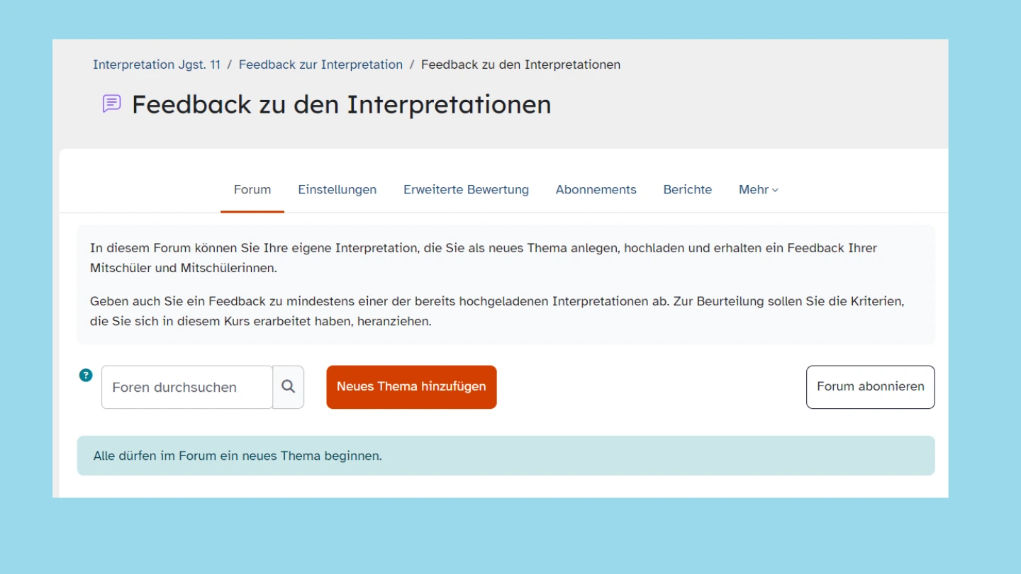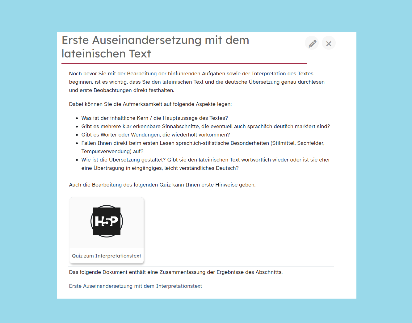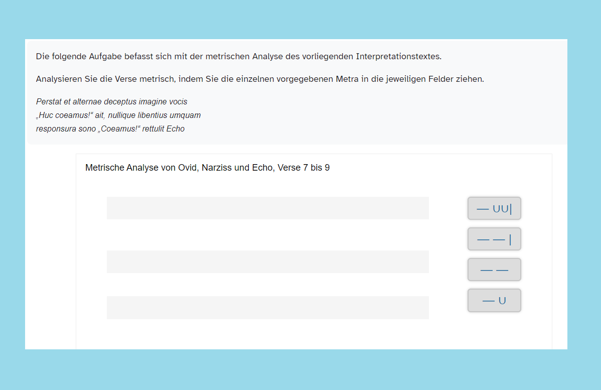 Im Abschnitt 3 erfolgt eine erste Auseinandersetzung mit dem lateinischen Text, wobei neben Hinweisen zum Vorgehen auch ein Quiz zur Verfügung gestellt wird. Der folgende Abschnitt 4 enthält unterschiedliche hinführende Aufgaben, von denen die Schülerinnen und Schüler diejenigen auswählen sollen, die sie für sich als sinnvoll erachten. Dabei wird neben allgemeinen Informationen zu Ovid und den Metamorphosen auch eine Auffrischung der Stilmittel gegeben. Der fünfte Abschnitt enthält Vorschläge zur Vorgehensweise bei der Interpretation. Es folgt ein Abschnitt zu Inhalt und Struktur des Textes, in dem die Lernenden diese Aspekte anhand einer Aufgabe erarbeiten. Der Abschnitt zu den formalen Aspekten des Textes beschäftigt sich sowohl mit der sprachlich-stilistischen Gestaltung als auch mit der Metrik. Im folgenden Abschnitt zum Verfassen der Interpretation werden wiederum Hinweise zu den Inhalten und zum Aufbau einer Interpretation gegeben. Auch wird den Schülerinnen und Schülern eine Beispiel-Interpretation zur Verfügung gestellt. Die verfassten Interpretationen sollen im Anschluss im Abschnitt „Feedback zur Interpretation“ hochgeladen werden. Dazu erhalten die Lernenden außerdem den Auftrag, auch zu mindestens einer Interpretation der Mitschülerinnen und Mitschüler ein Feedback abzugeben. Im letzten Abschnitt wird eine Aufgabe zum Vergleich der Beispiel-Interpretation mit einer von einer KI generierten bereitgestellt.