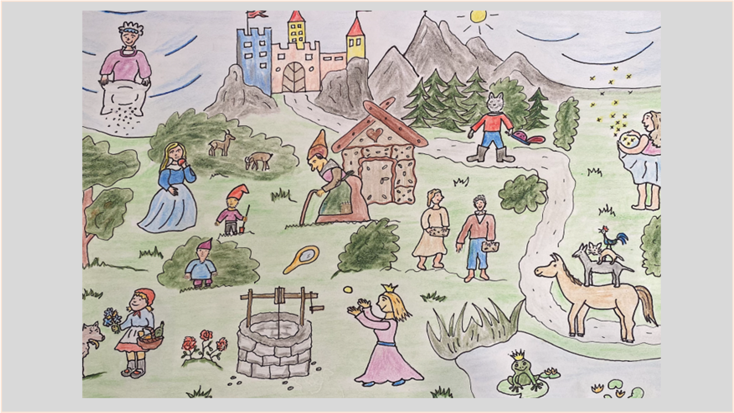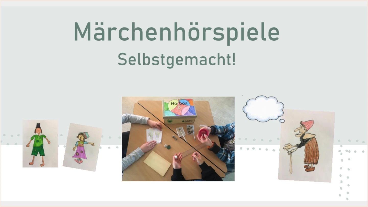 Märchen-Wimmelbild, selbstgezeichnete Märchenszenen, Hörboxen, Material zur Klangerzeugung, Aufnahmegerät und digitale Pinnwand, Hörbrillen (Masken, die die Augen verdecken)