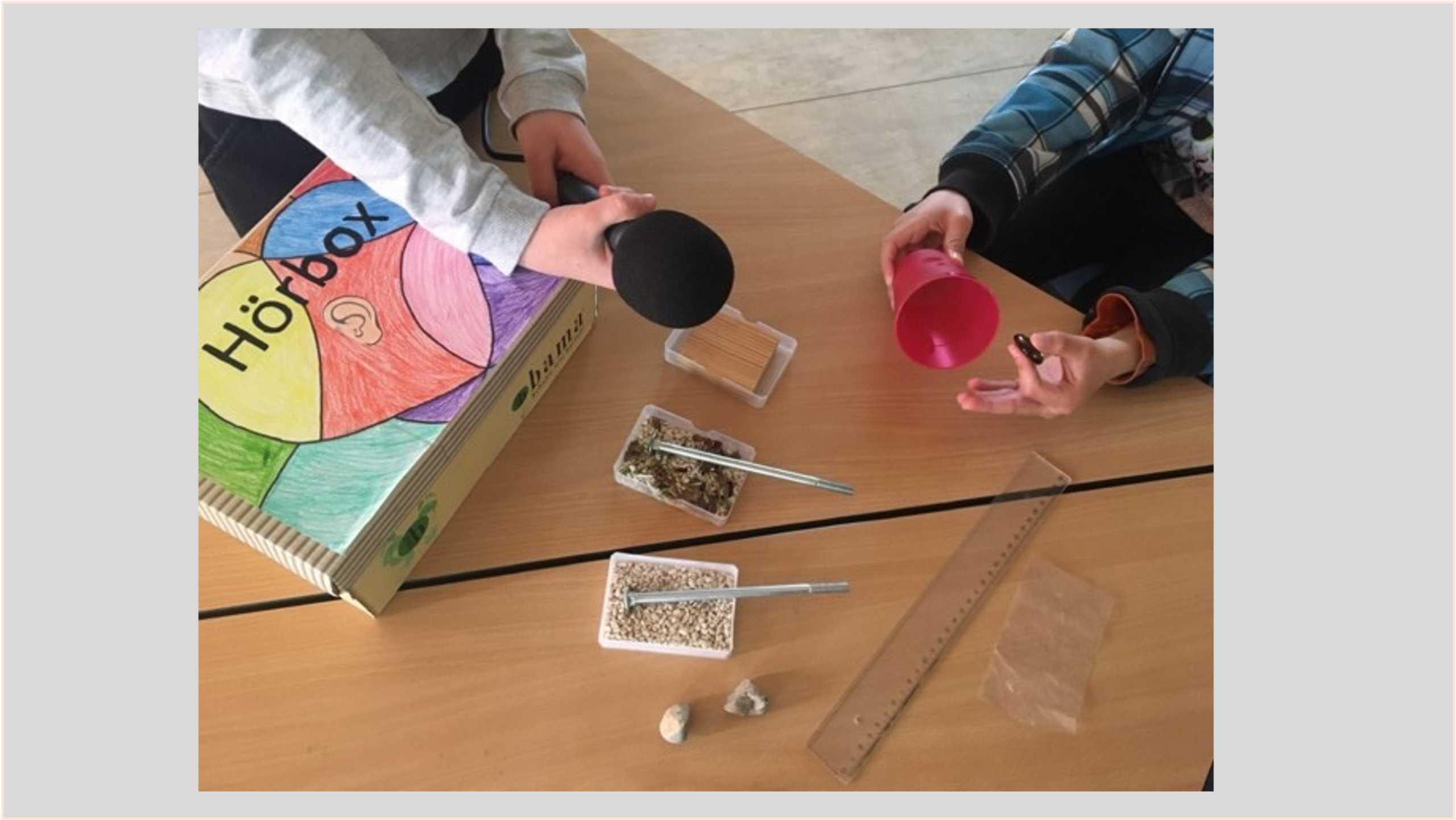 Zum Einstieg in die Unterrichtssequenz beschäftigen sich die Kinder mit Geräuschen. Diese Phase bietet sowohl die Möglichkeit der Sensibilisierung für gutes Zuhören, als auch kreativ Klänge zu gestalten. Die Lehrkraft beginnt Unterrichtseinheiten mit Zuhörübungen wie der „Ohrenmassage“ und stellt durch Zuhörrituale und Spiele bewusst den Hörsinn in den Mittelpunkt. Um den Kindern das Zuhören zu erleichtern, können hierbei sogenannte Hörbrillen benutzt werden.