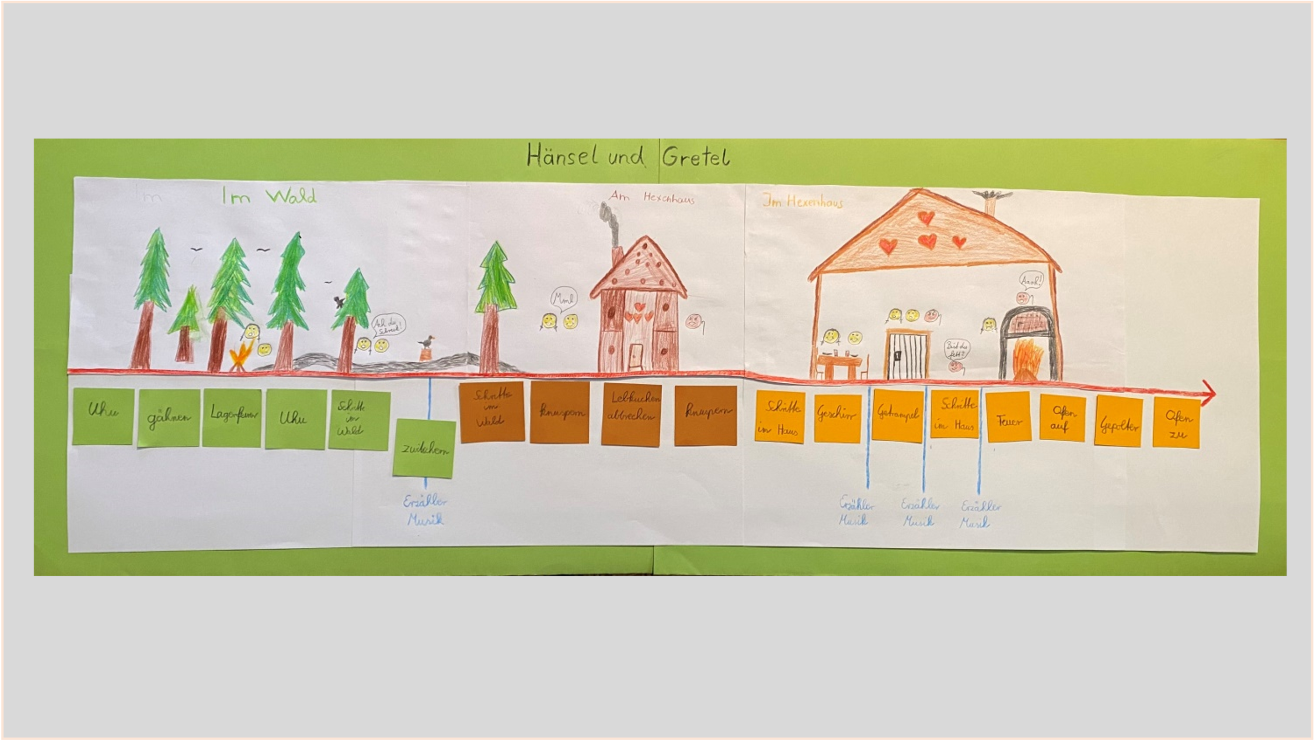 Die Lehrkraft zeigt den Kindern im Anschluss, wie sie die Handlung des Märchens auf einer Timeline im szenischen Ablauf einfach zeichnerisch festhalten können. Dabei bietet es sich an, die zuvor erstellten Bilder zu den Märchenszenen zu integrieren und als Hilfestellung zu verwenden.