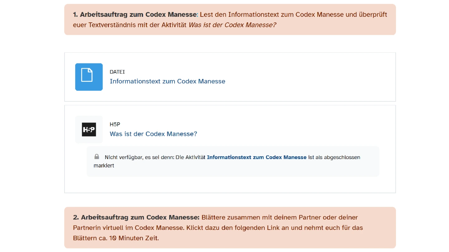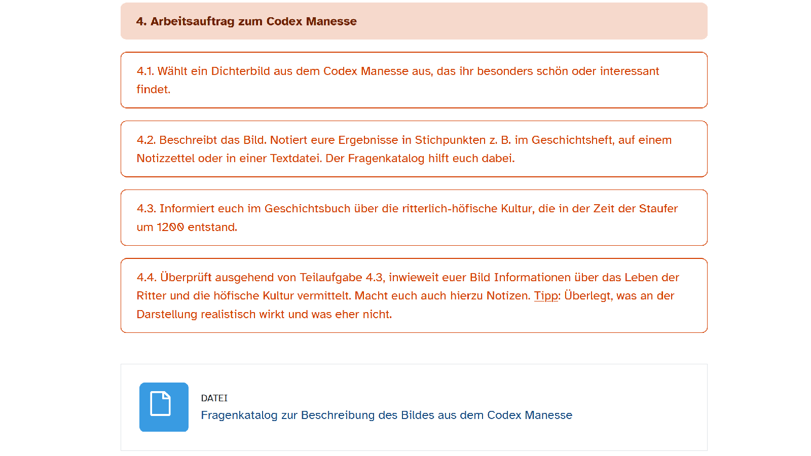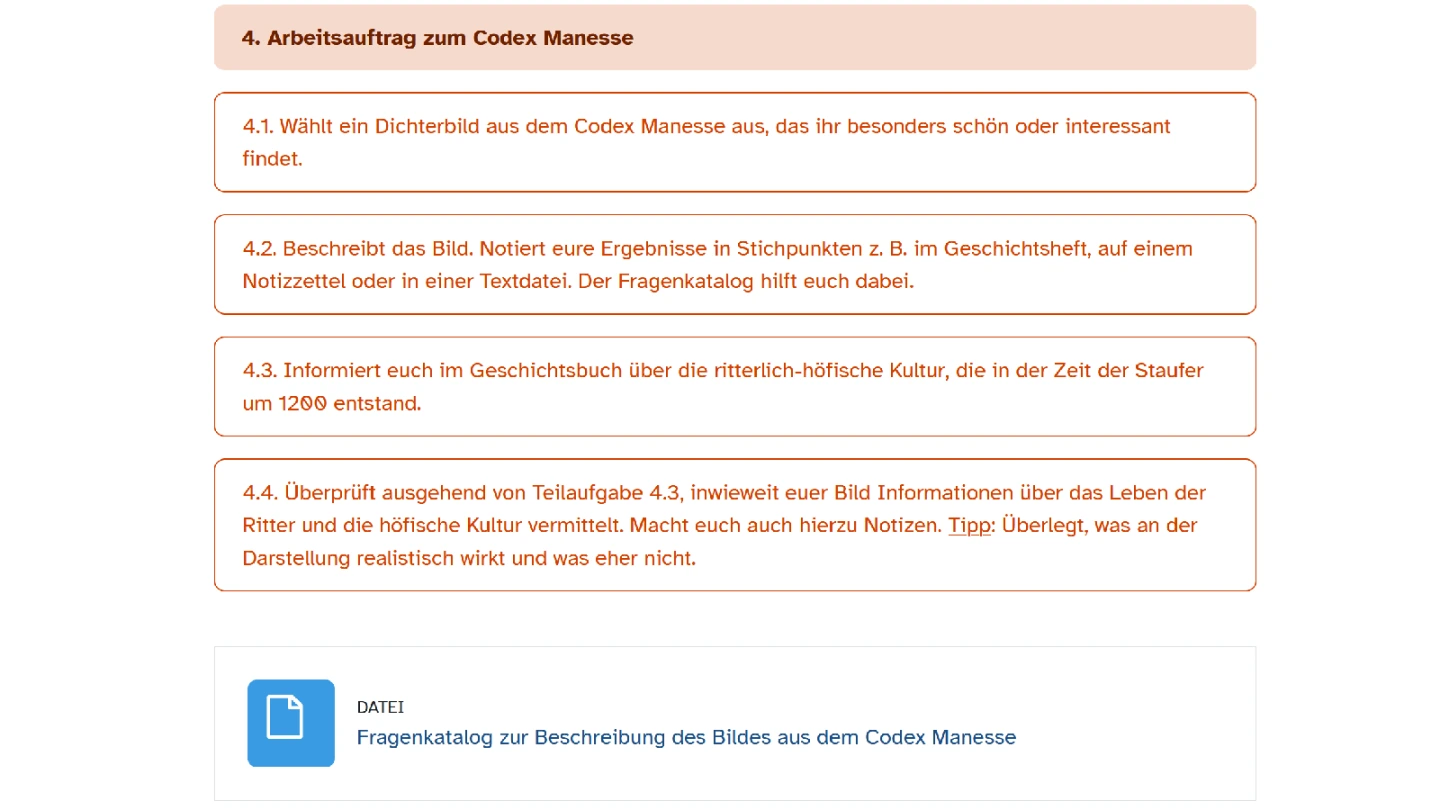 Arbeitsauftrag 1: Anhand eines kurzen Texts erarbeiten die Schülerinnen und Schüler wesentliche Informationen zum Codex Manesse. Mithilfe eines Quiz überprüfen sie ihren Wissensstand. Der Text kann sowohl gemeinsam in der Klasse als auch in Einzelarbeit gelesen werden.