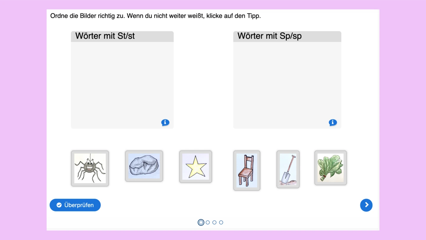 Folie 3: Passende Wörter mit St/st oder Sp/sp zu den richtigen Sätzen ziehen.