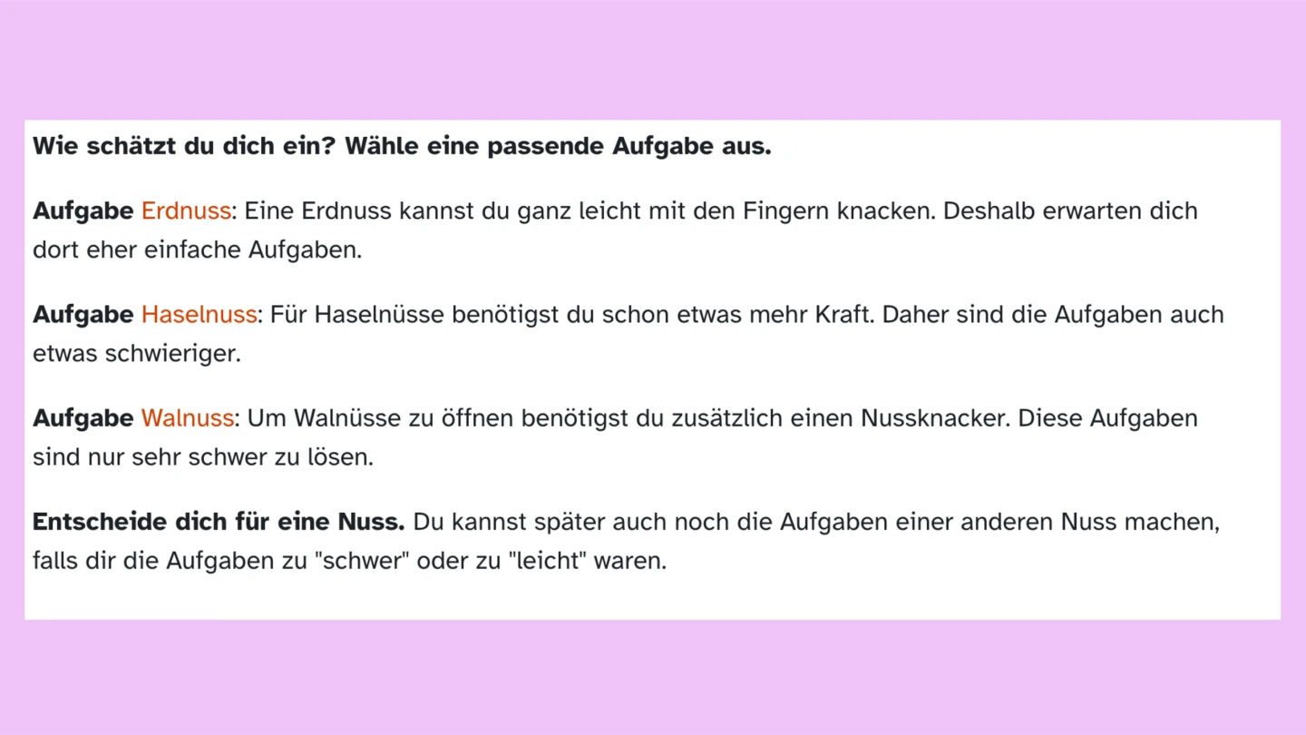 Die Schülerinnen und Schüler nehmen eine Selbsteinschätzung ihrer Fähigkeiten vor, welche bei Bedarf auch durch den Lehrer unterstützt werden kann. Diese Einschätzung dient der Einteilung in eine der drei Differenzierungsgruppen: Erdnuss, Haselnuss und Walnuss.