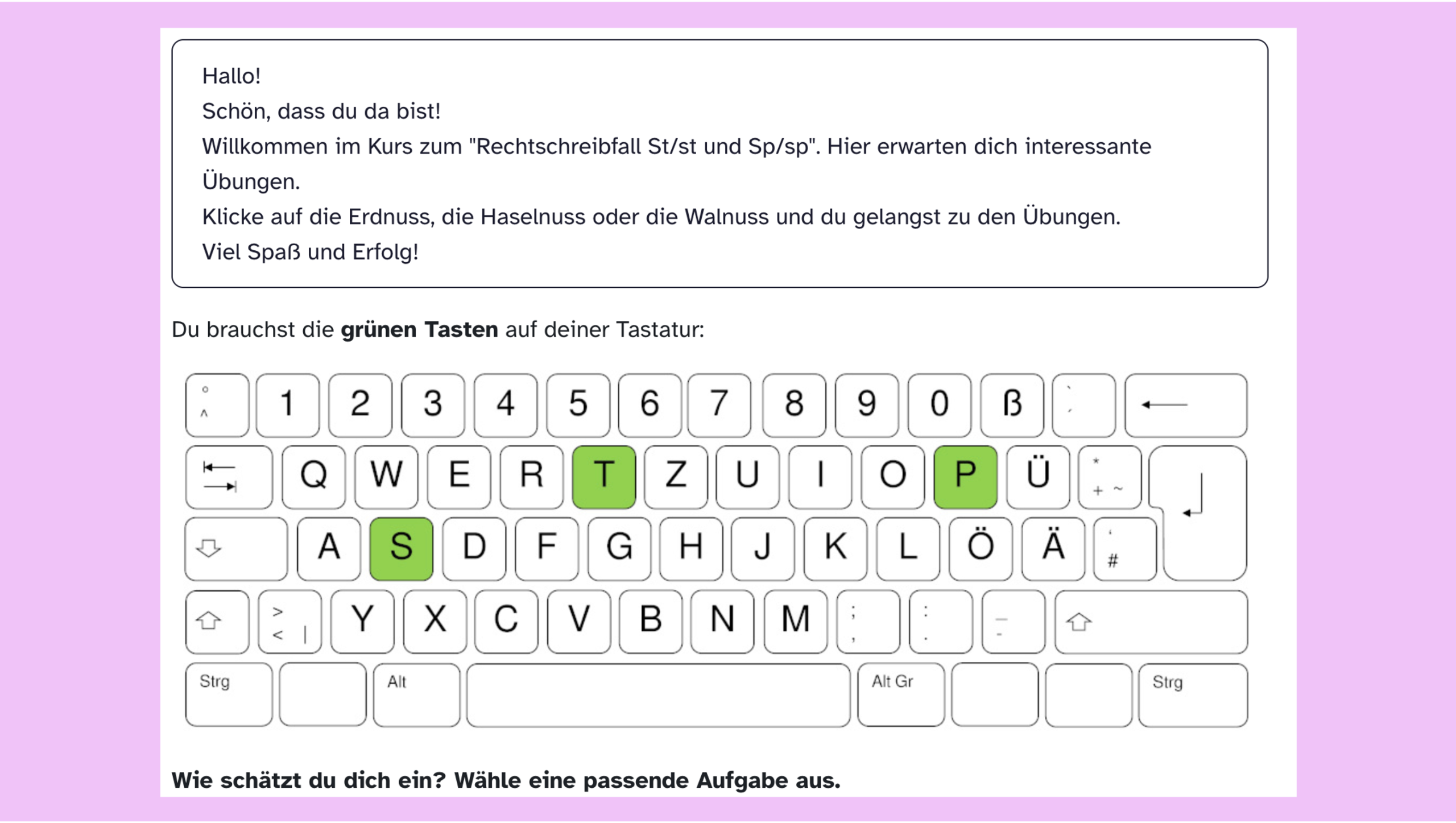Gruppe Haselnuss (mittel) und Walnuss (schwer): Die gleichen Aufgabentypen wie Erdnuss, jedoch quantitativ und qualitativ differenziert. Zusätzliche Übung der Schreibweise im freien Schreiben durch das Formulieren von Sätzen.