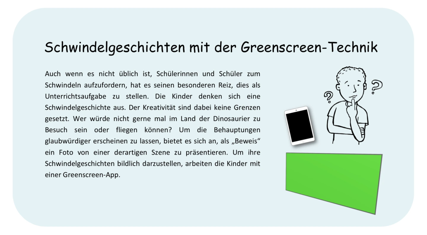 Die Erstellung eines Fotos mit der Greenscreen-App ist auf viele Bereiche, Fächer und Altersstufen übertragbar. Sie bietet vielfältige Ansatzpunkte, um ein kreatives digitales Artefakt zu erstellen. Im Unterricht moderner Fremdsprachen, besonders in den ersten Lernjahren, bieten sich Schwindelgeschichten beispielsweise zur Förderung der Sprechkompetenz sowie zur Einübung und Verwendung verschiedener Zeiten an.
