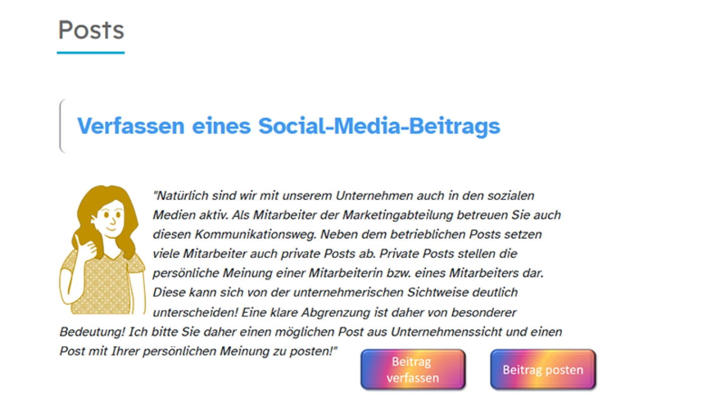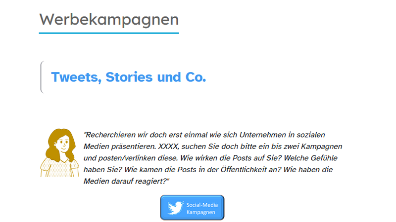In der Digitalen Lernaufgabe (DigLA) setzen sich die Schülerinnen und Schüler mit der Wirkung verschiedener Werbekampagnen zu #diversity #inclusive #bodypositivity in Social-Media-Netzwerken auseinander. Basierend auf einer Internetrecherche beschäftigen sie sich mit der Wirkung derartiger Kampagnen auf sich selbst und mit der öffentlichen Meinung dazu. Aus einer so entstehenden Pro-Kontra-Stoffsammlung verfassen die Lernenden fiktive Social-Media-Beiträge. Die Lernenden sollen im Rahmen der Aufgabe erkennen, dass sich die betriebliche Auffassung und die damit verbundene Präsentation in Social-Media-Netzwerken von der privaten Meinung unterscheiden kann.