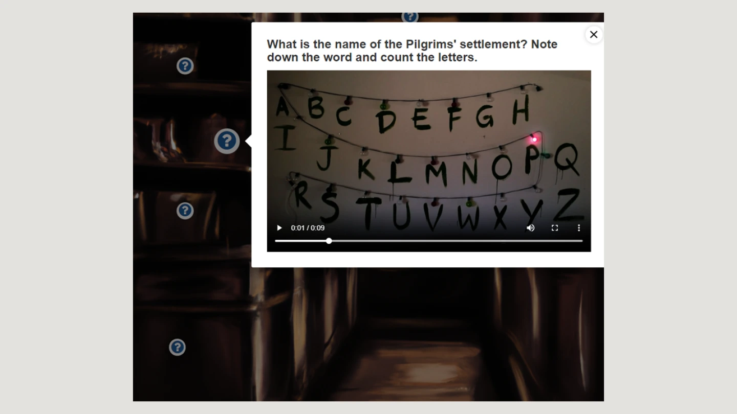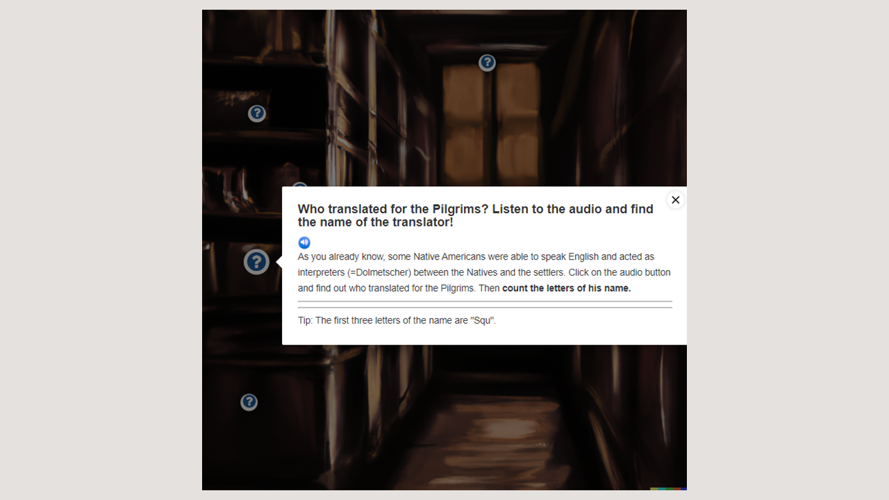 Im Flur (Kachel 2) befinden sich verschiedene Regale mit Hotspots. Beim Anklicken öffnen sich weitere Aufgaben, die sich thematisch auf die Ankunft der Siedler in Neuengland beziehen. Um die Tür am Ende des Flurs öffnen zu können, ist erneut ein Zahlencode nötig.