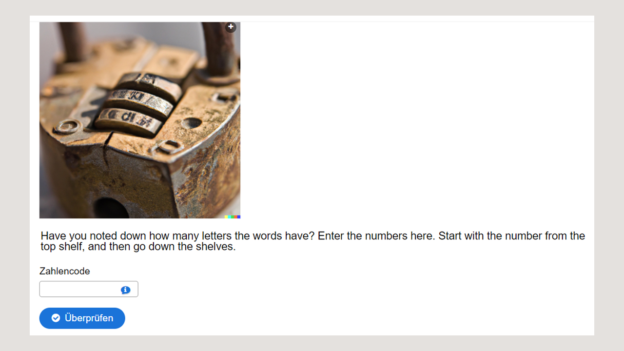 Die erste Kachel „The Secret Hut“ führt in das virtuelle Szenario ein. Um die Hütte betreten zu können, müssen die Lernenden ein Quiz und eine drag-and-drop-Aufgabe lösen, die Vorwissen zu Neuengland aktiviert. Ein vierstelliger Zahlencode, der sich aus zwei Zahlen in der drag-and-drop-Aufgabe zusammensetzt, öffnet die Eingangstür.