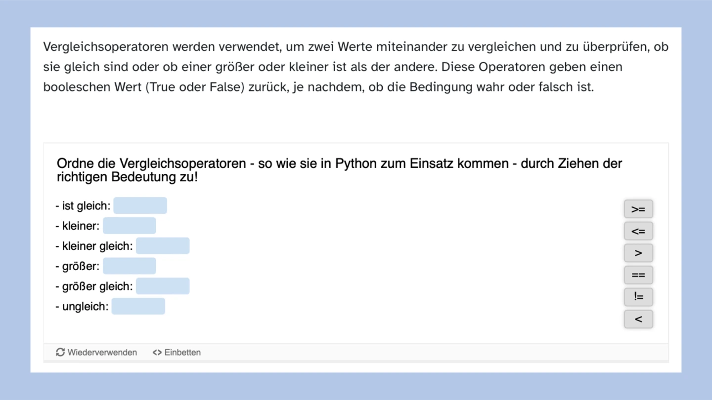 In den ersten beiden Teilaufgaben wiederholen die Schülerinnen und Schüler die in Python verwendeten Vergleichsoperatoren und die Syntax der Verzweigung.