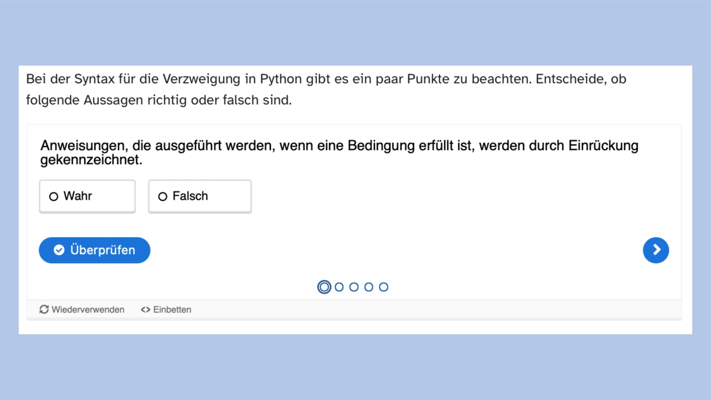 In der Digitalen Lernaufgabe üben und vertiefen die Schülerinnen und Schüler die Modellierung und Programmierung der Verzweigung in Python. Dabei führen sie eine Wiederholung zu Vergleichsoperatoren und der Syntax der Verzweigung durch, modellieren einen Programmablaufplan bzw. Struktogramm und schreiben einen Programmcode in der Programmiersprache Python.