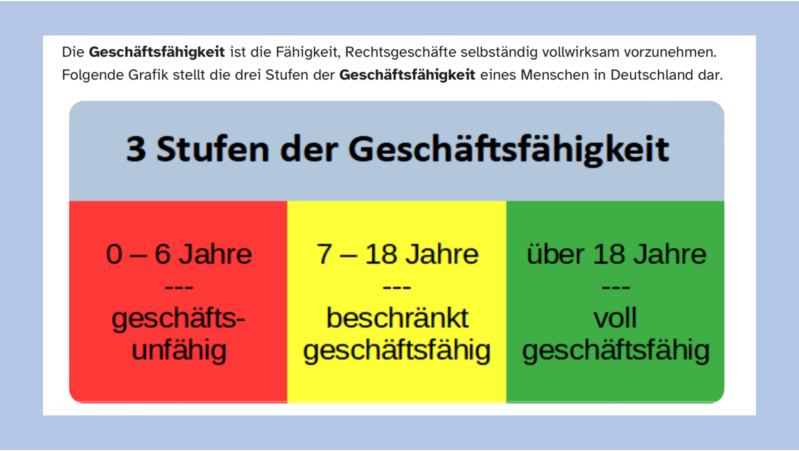 In der vierten Aufgabe modellieren die Lernenden zuerst die Altersstufen der Geschäftsfähigkeit als Programmablaufplan bzw. als Struktogramm. Ziel ist es, für ein eingegebenes Alter die richtige Stufe der Geschäftsfähigkeit auszugeben. Im Anschluss erstellen die Lernenden das dazugehörige Programm in Python. Ihre Ergebnisse veröffentlichen sie in der Aktivität „gegenseitige Beurteilung“. Anhand verschiedener Kriterien können sich die Schülerinnen und Schüler gegenseitig Feedback geben.