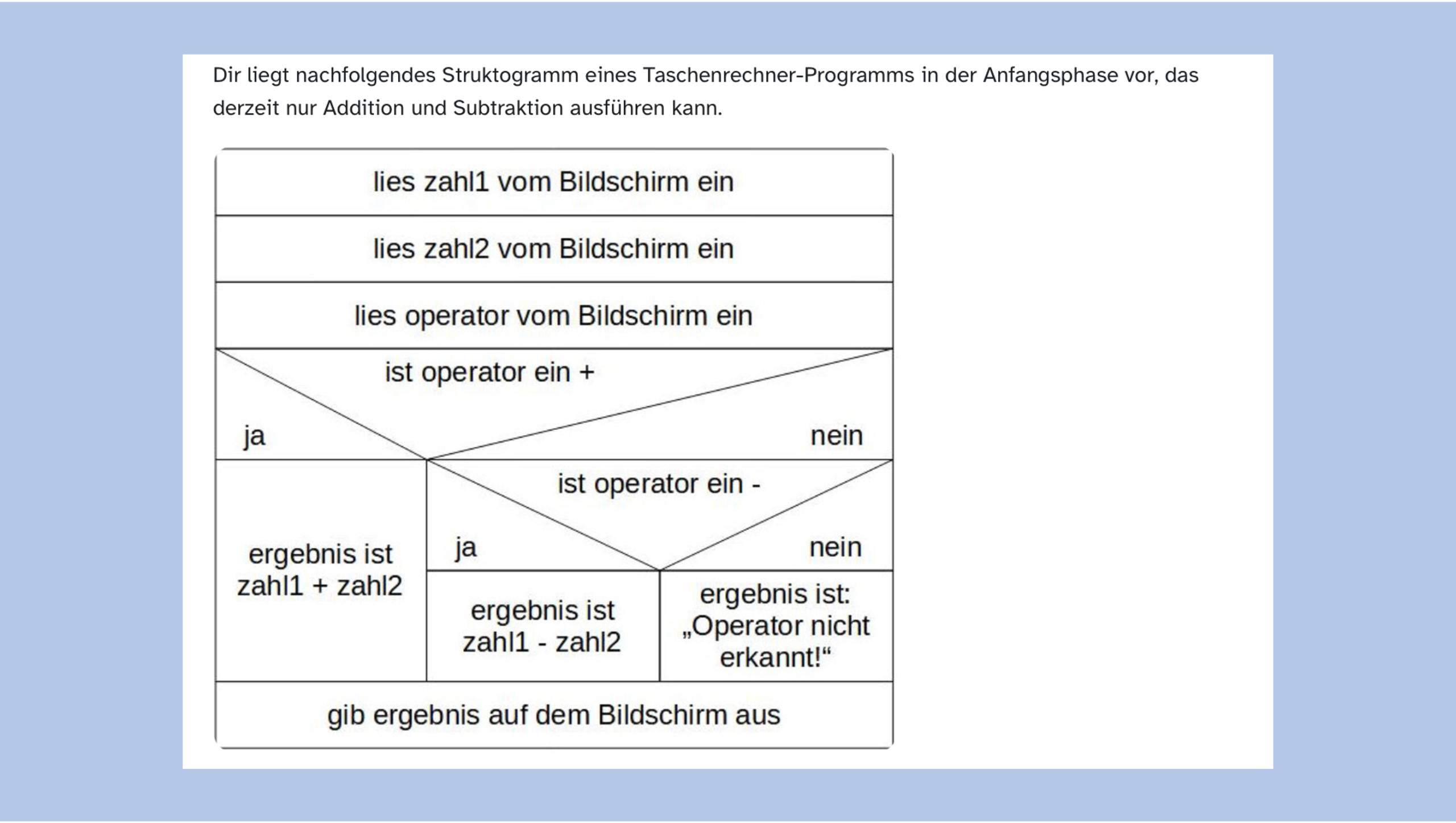 In der letzten Teilaufgabe programmieren die Lernenden einen einfachen Taschenrechner anhand eines vorgegebenen Struktogramms. Dieser erfordert die Eingabe von zwei Zahlen und eines Rechenoperators, um entweder eine Addition oder Subtraktion durchzuführen und das Ergebnis auf dem Bildschirm auszugeben. Vor dem Programmieren sollen die Schülerinnen und Schüler potenzielle Probleme in einem Forum diskutieren.