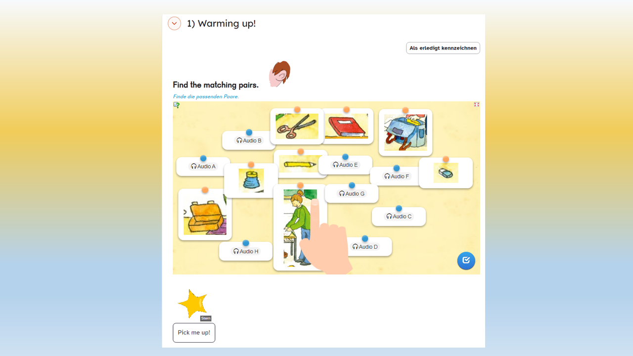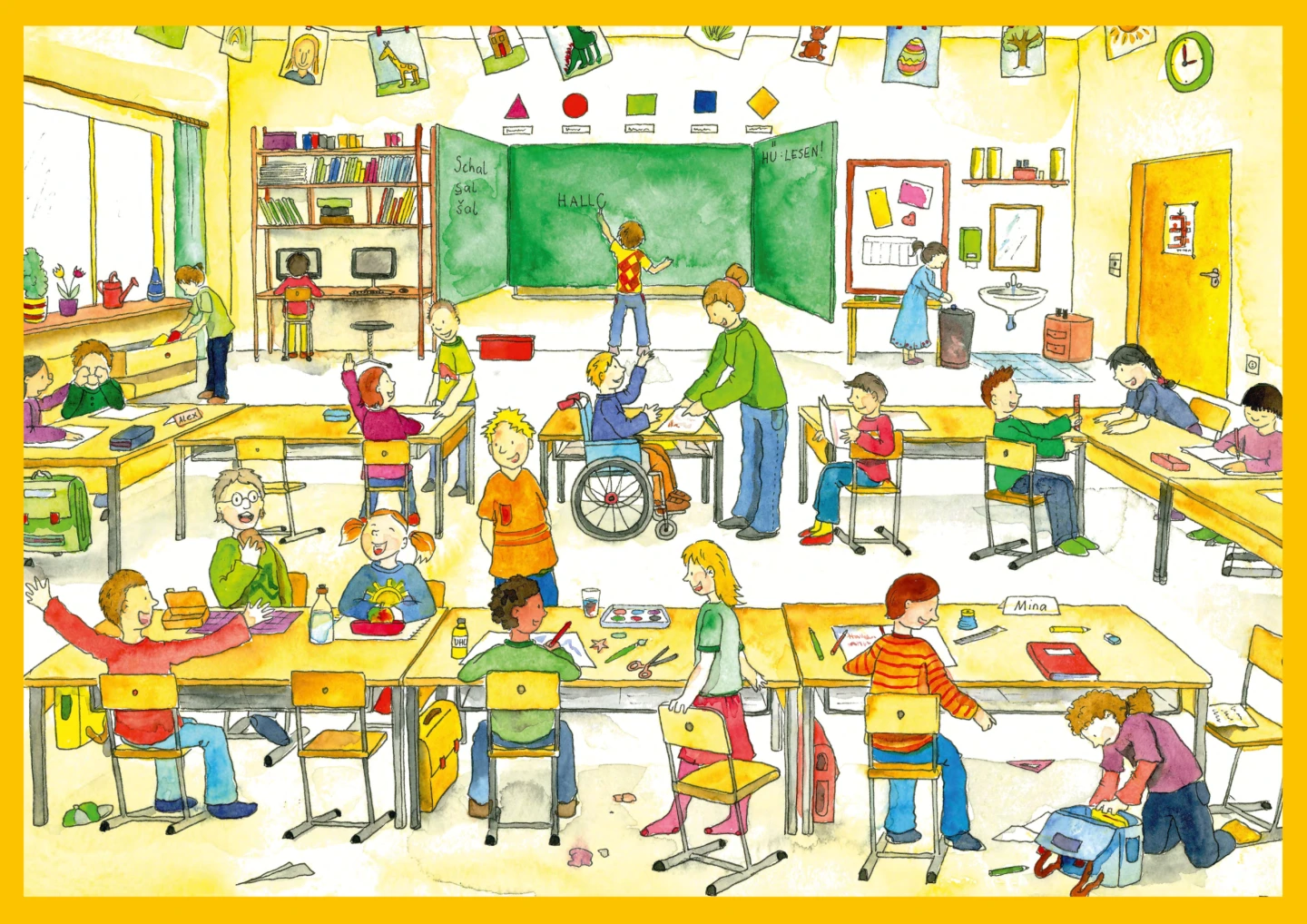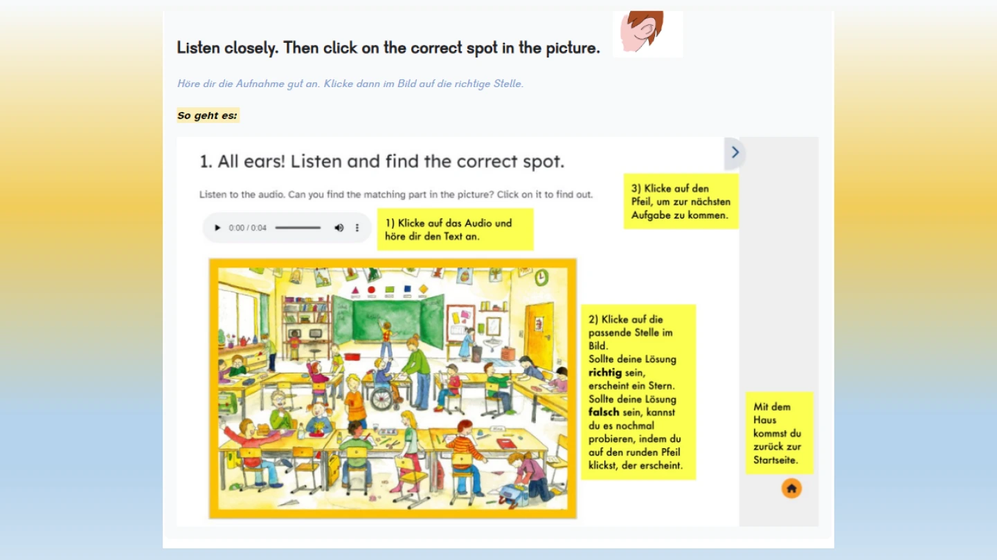 Im Mittelpunkt der Unterrichtseinheit steht das Thema „at school“, eingebettet in ein Wimmelbild eines Klassenraums, das als visuelles Ankerbild dient. Die Schülerinnen und Schüler hören Dialoge, die Situationen und Objekte im Klassenraum beschreiben. Diese Dialoge enthalten einfache Sätze und gängige Vokabeln, die bereits im Wortschatz der Kinder verankert sind oder leicht ergänzt werden können.