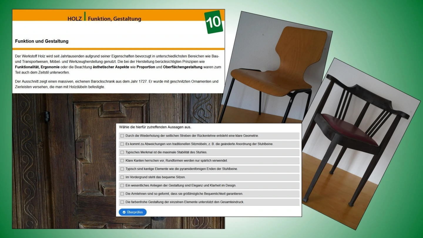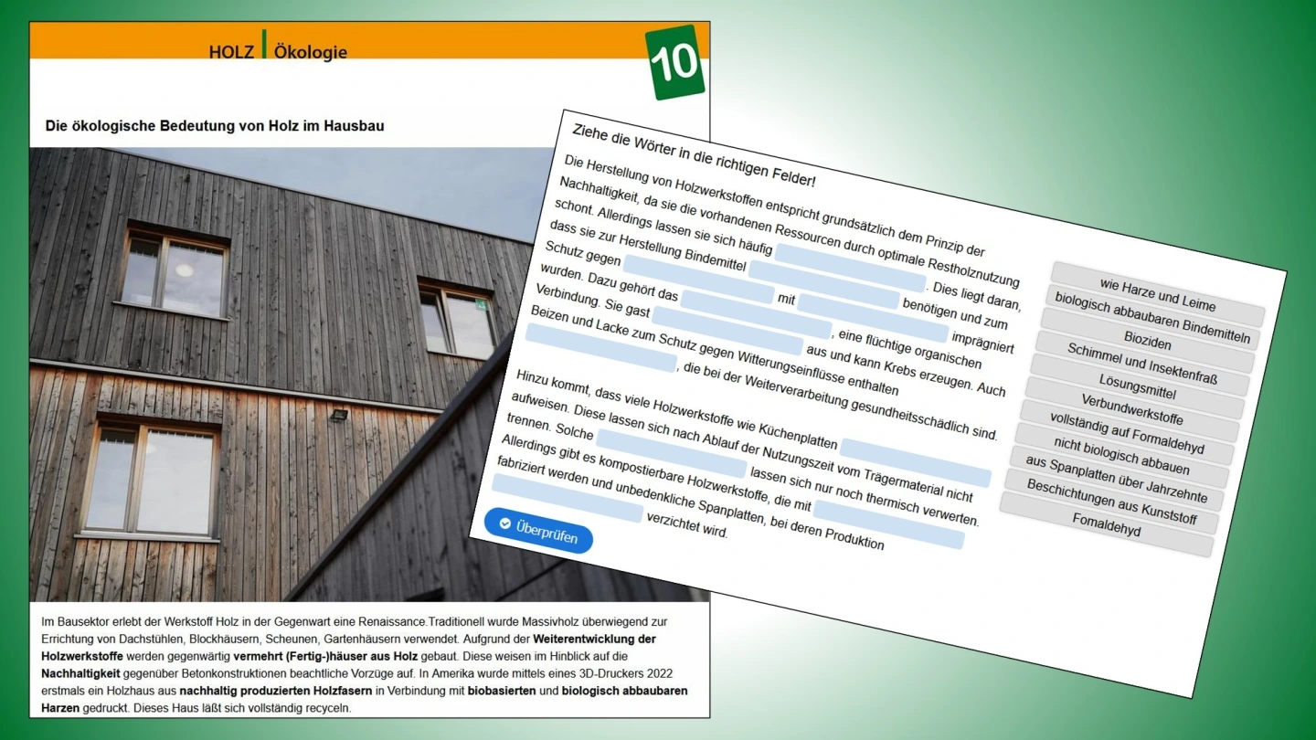 Die Lernenden wiederholen und vertiefen die Inhalte des Infoheftes Holz im Rahmen interaktiver Aufgabenstellungen. Dabei stehen die folgenden Lernziele im Fokus: