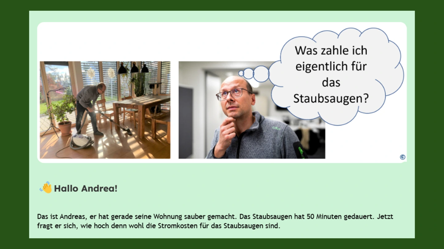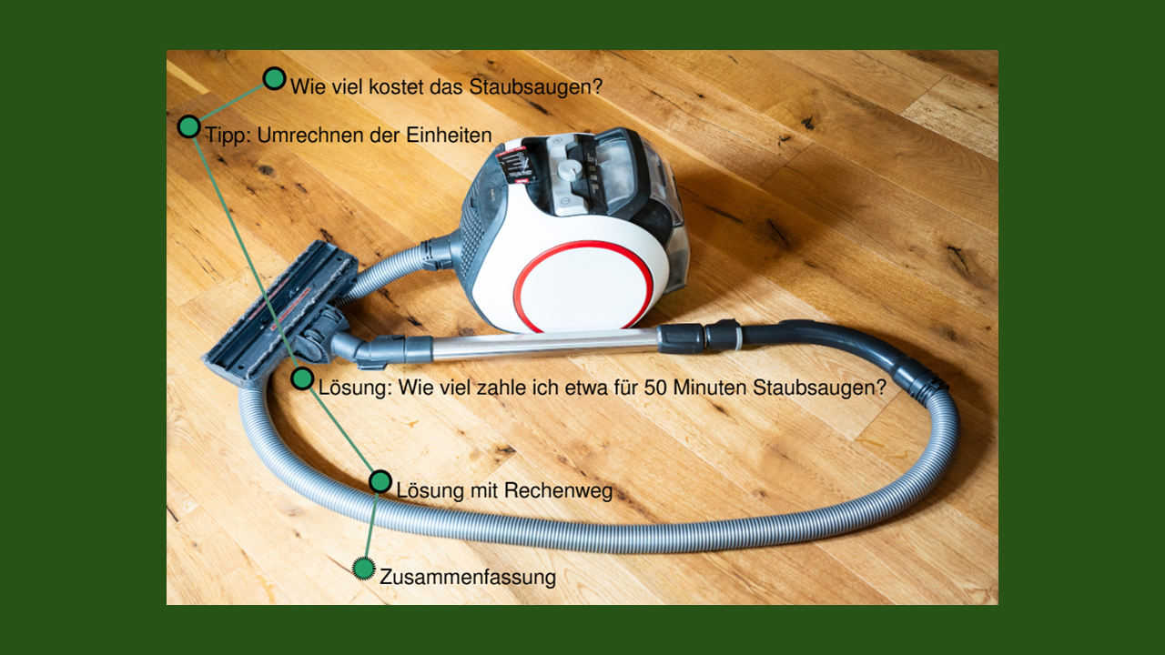 Den Rahmen der Unterrichtseinheit bildet die Frage nach den Stromkosten für das Staubsaugen. Die Lernenden setzen sich hier zunächst über Schätzungen mit den Stromkosten auseinander.